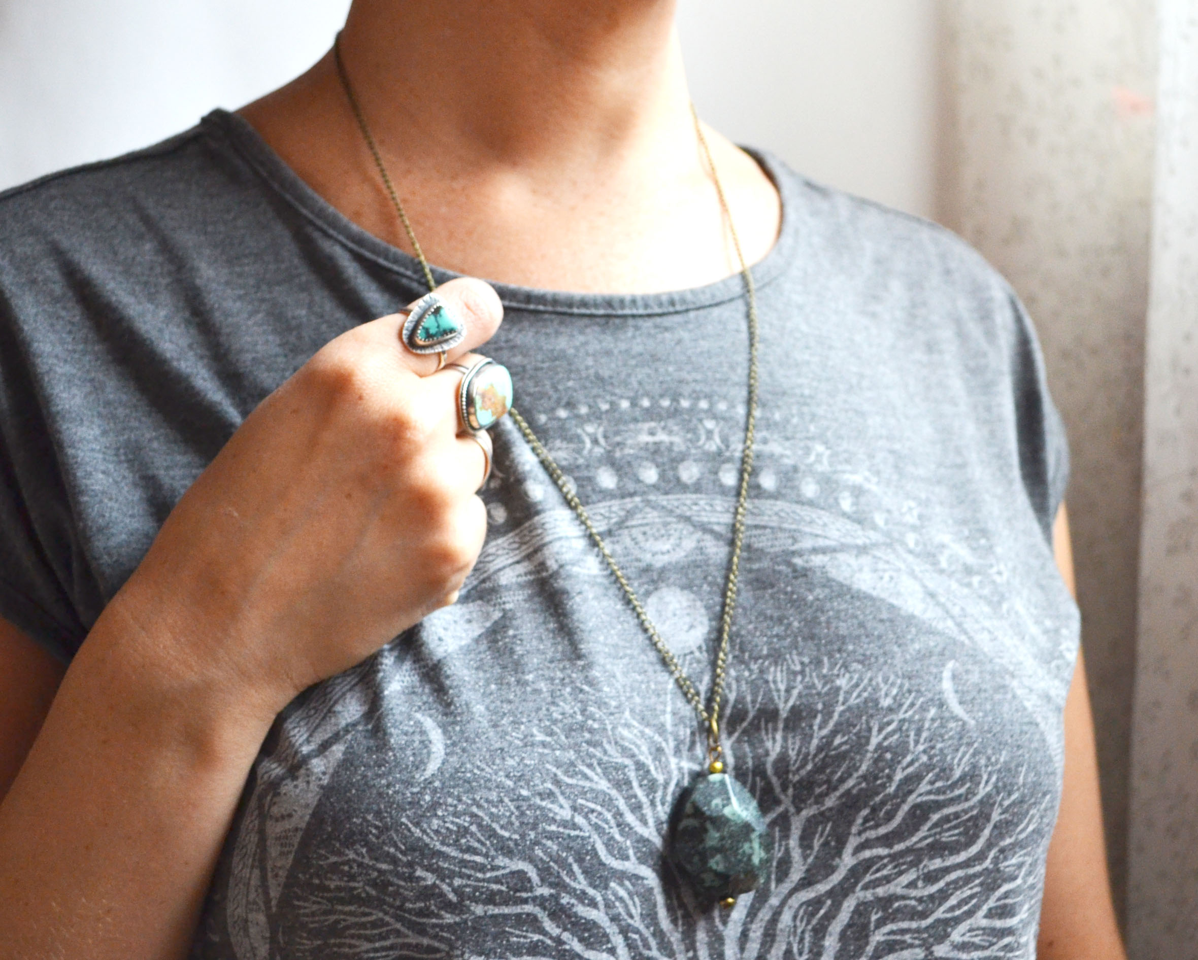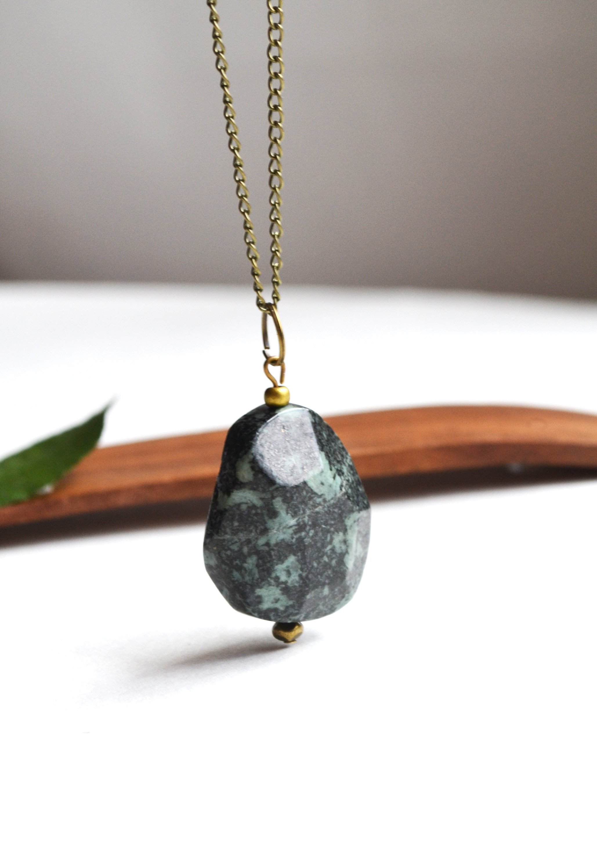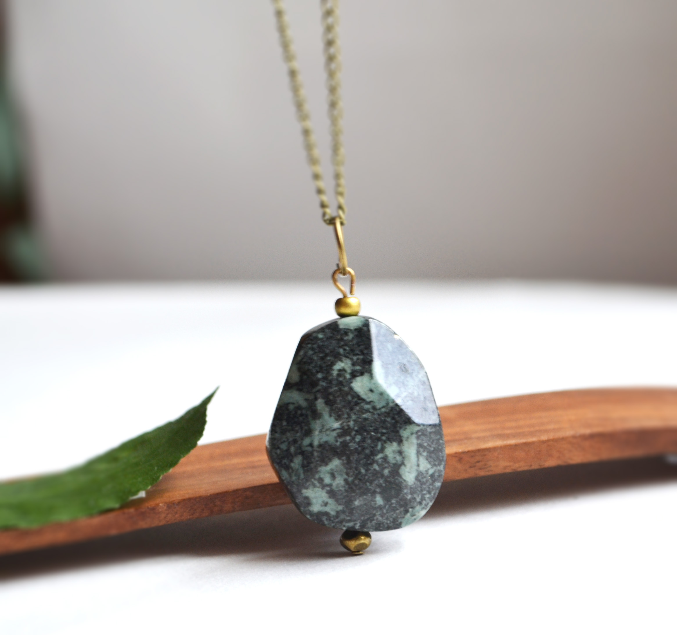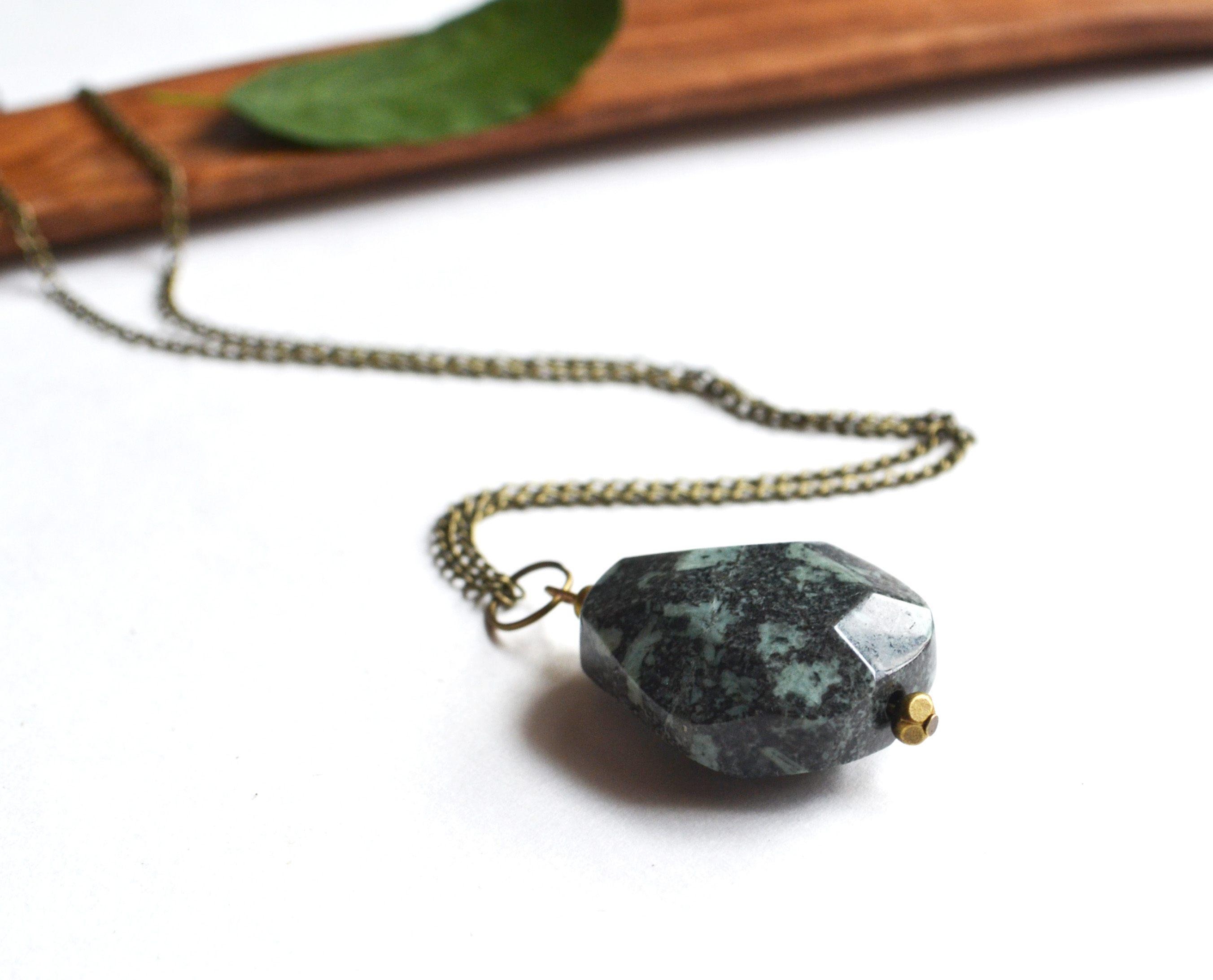 This long gemstone necklace is a tumbled African Turquoise Jasper faceted stone which I have hung from a long brass chain. View one of the photos to see it worn for size reference. Choose chain length at checkout.