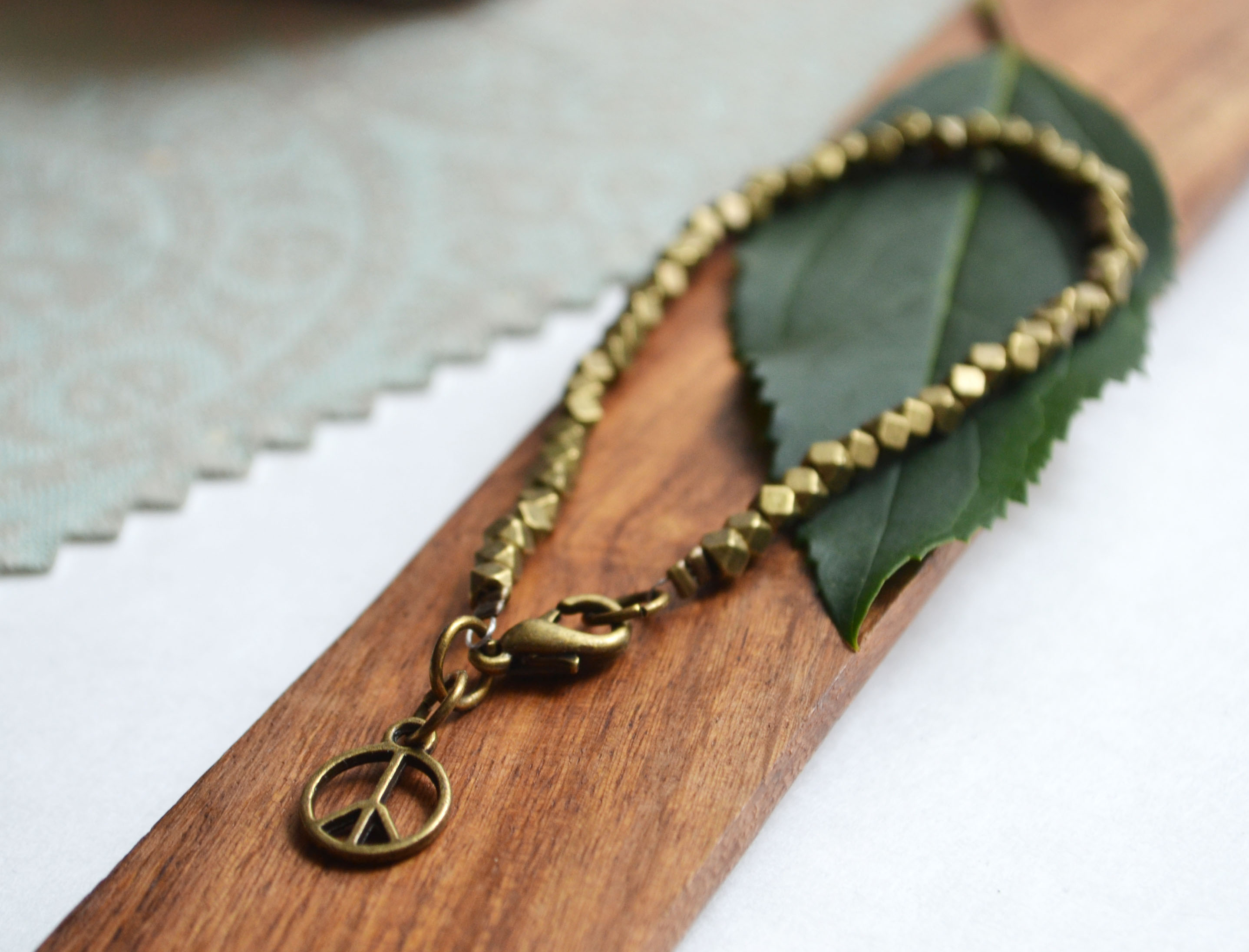A simple brass bead bracelet which you could wear on its own or with other bracelets. It comes with a simple small peace sign which hangs from the clasp. Choose your bracelet length at checkout.
