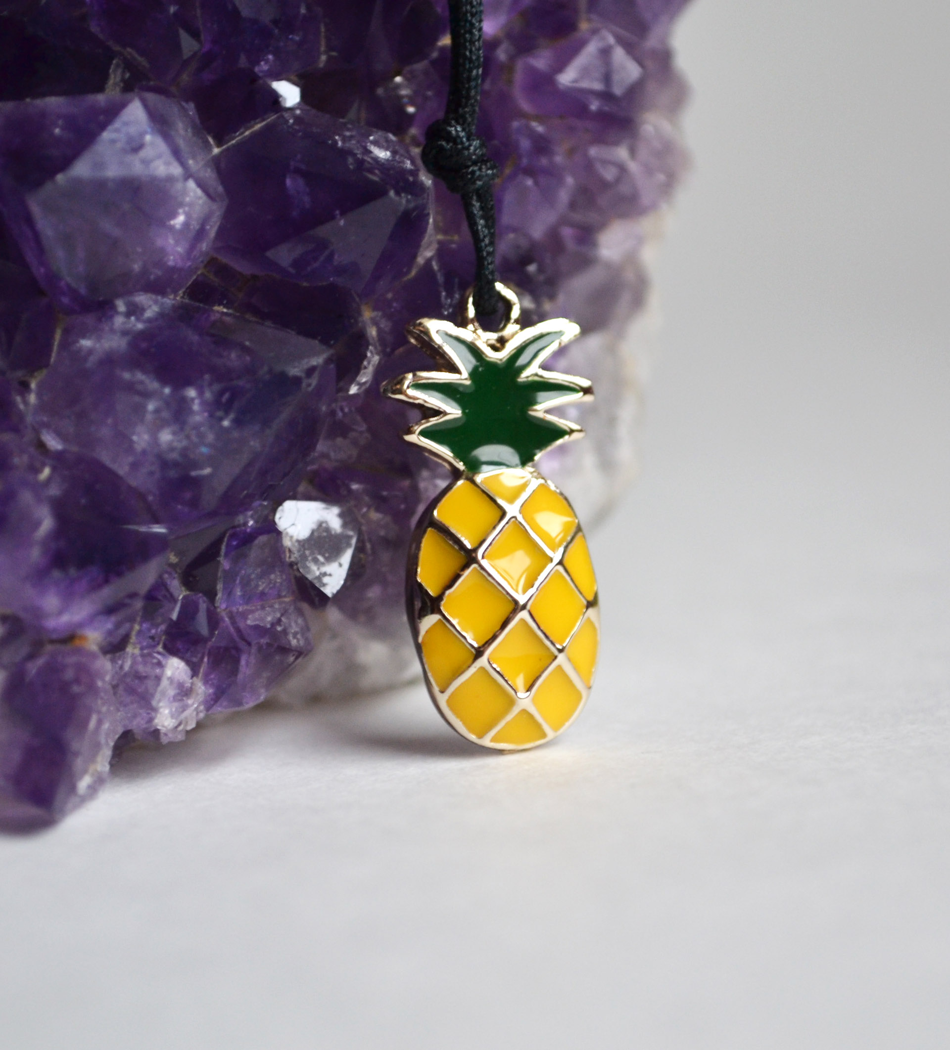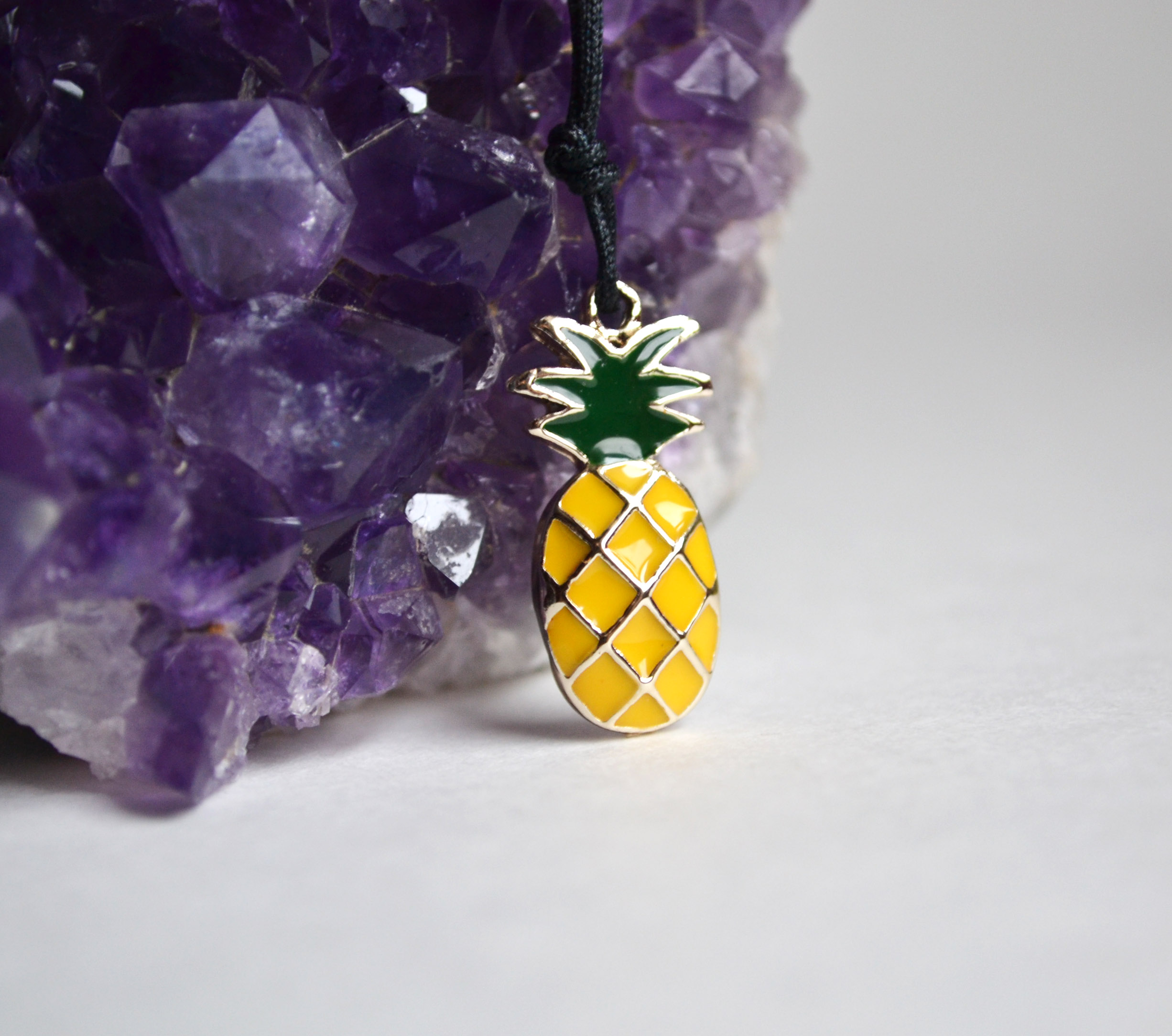 A beach inspired necklace, this summer Pineapple will look great on a longer cord or as a short choker style necklace. It is a small enamel Pineapple with a gold trim. Please view all of the photos for detail and choose your cord length at checkout.