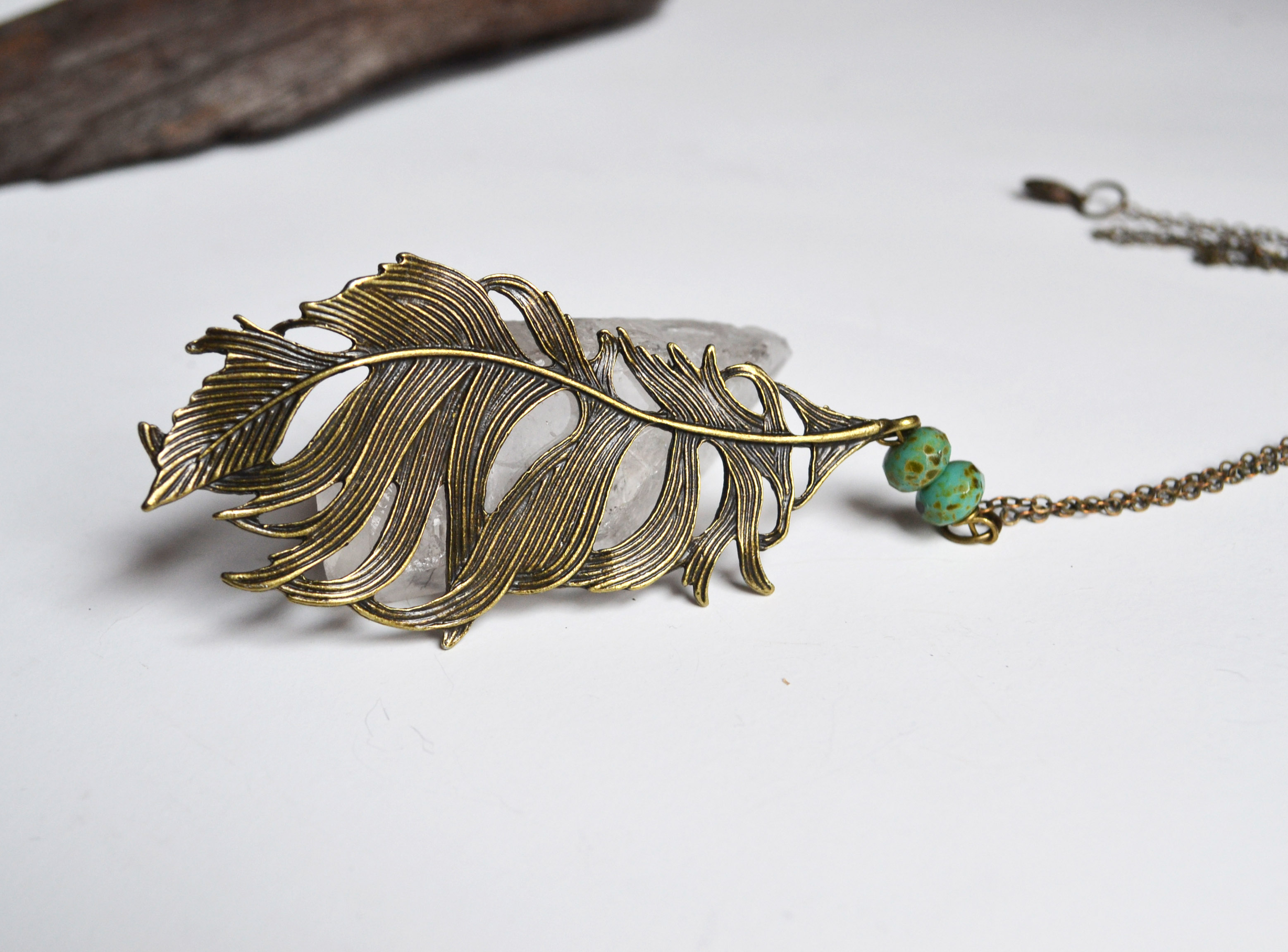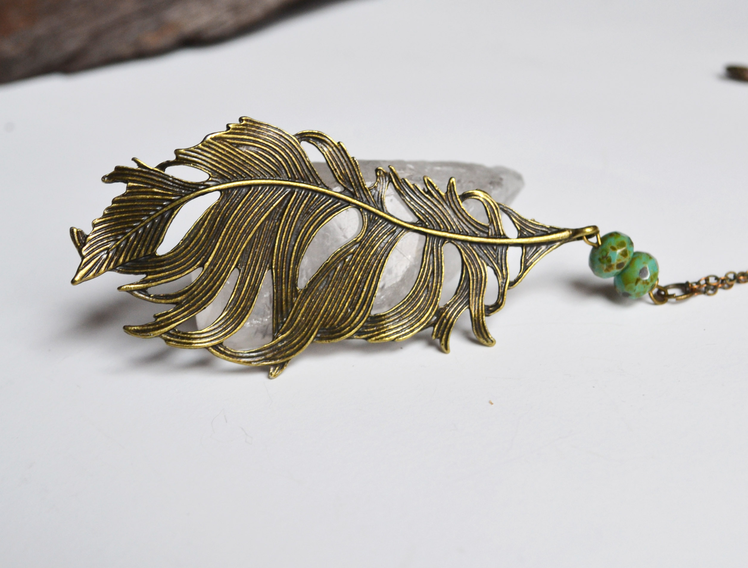 A pretty floating feather paired with two turquoise rondelle beads. This feather boho necklace will look great on a longer chain and paired with a long flowing maxi skirt and tank.