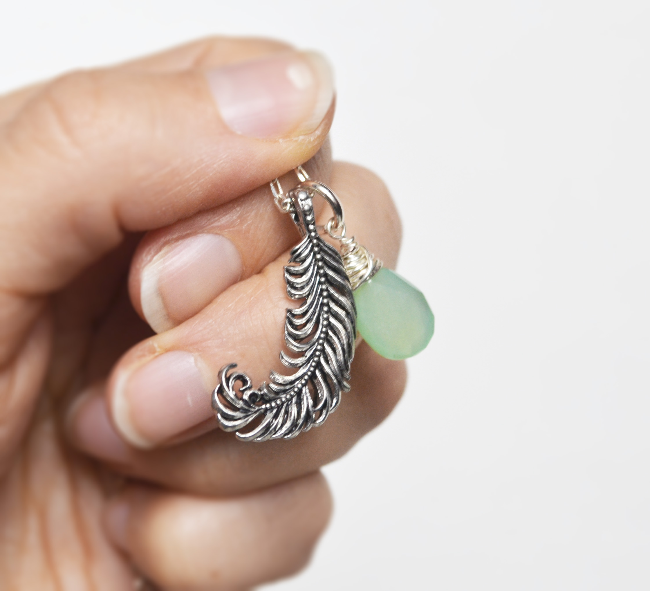 A gorgeous detailed feather on both sides is paired with a Seafoam Chalcedony drop. These two will come with a long or short silver plated chain. Please view all of the photos for details.