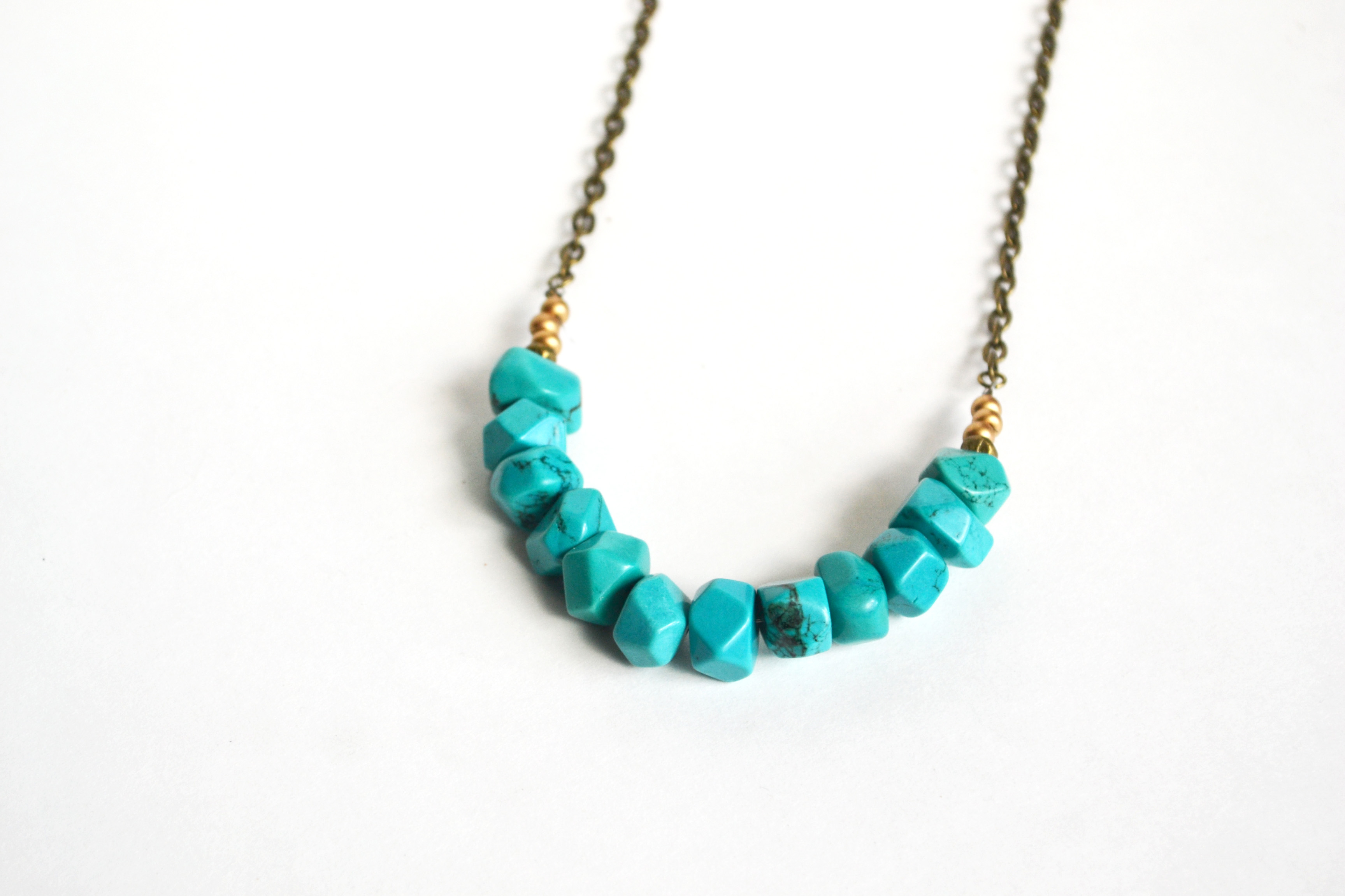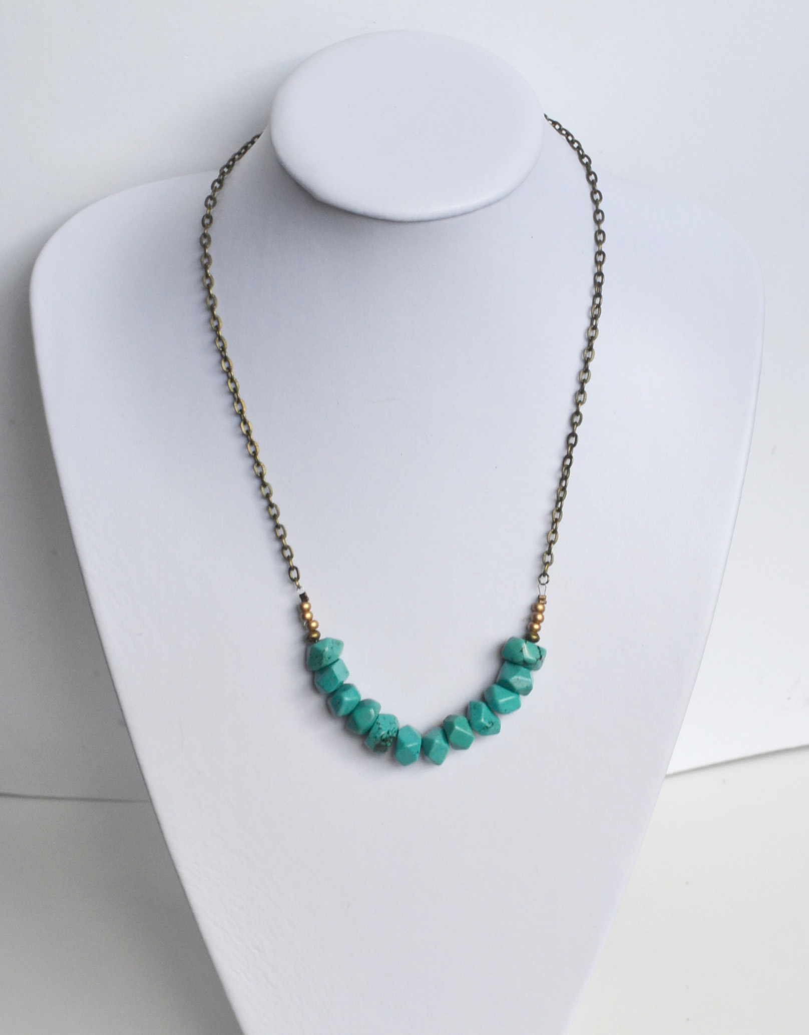 A beautiful shade of turquoise, this necklace hangs from a brass chain and has gold colored seed beads as well as turquoise colored beads.