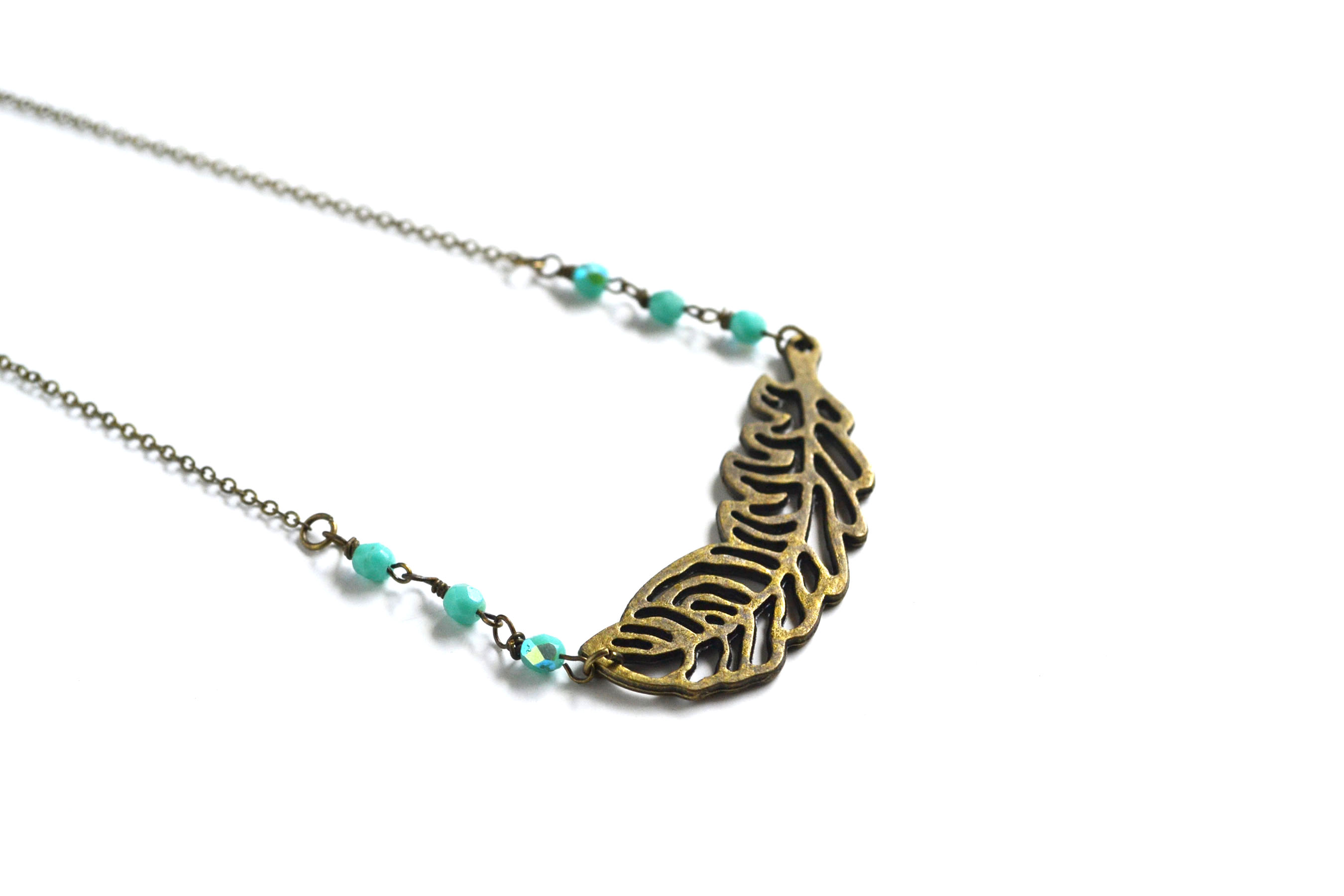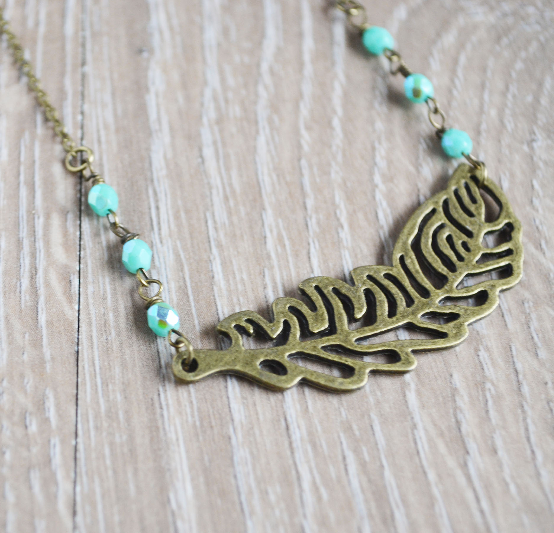 Feather Bohemian Necklace,Boho Jewelry, Mint Czech Beads