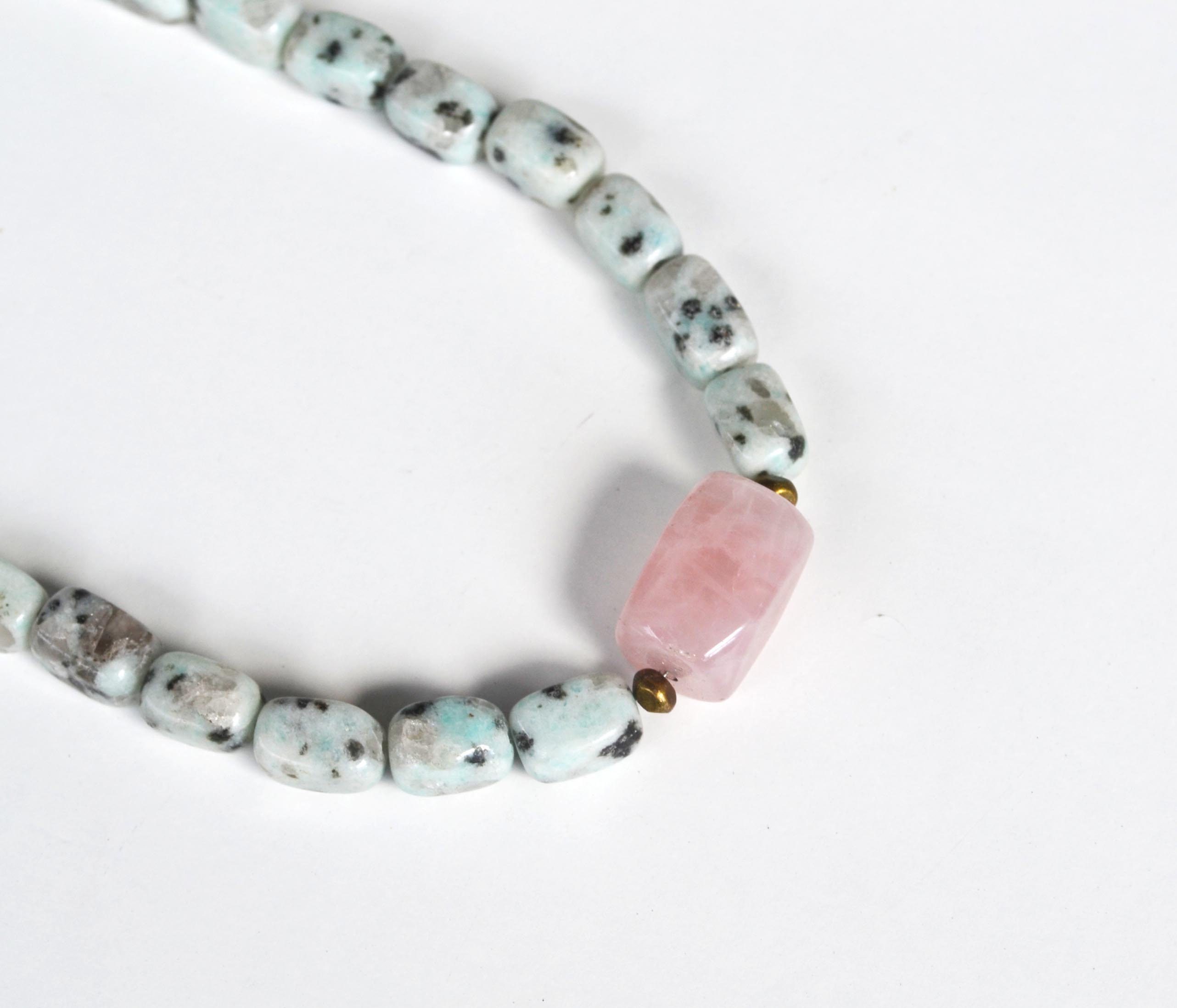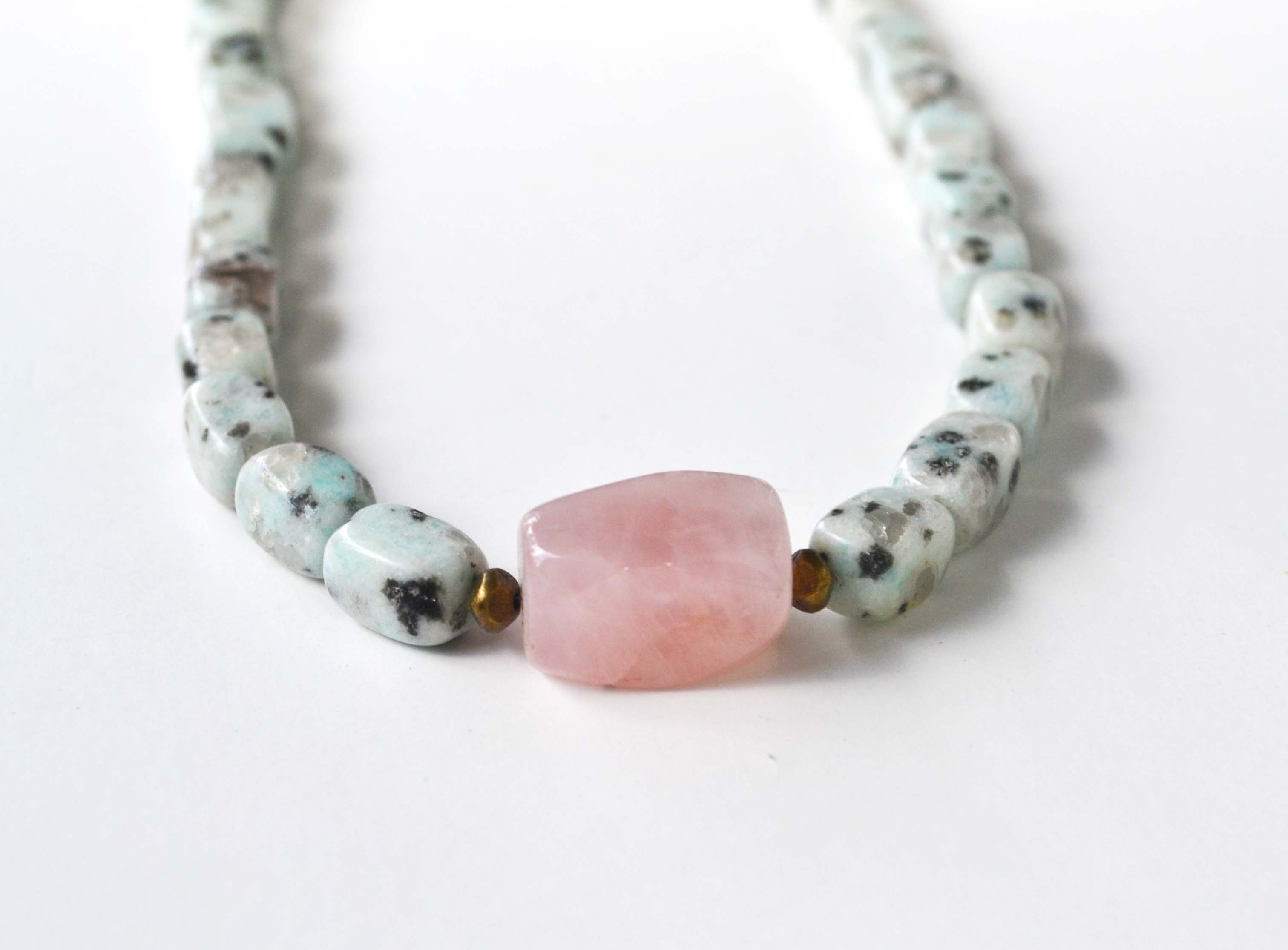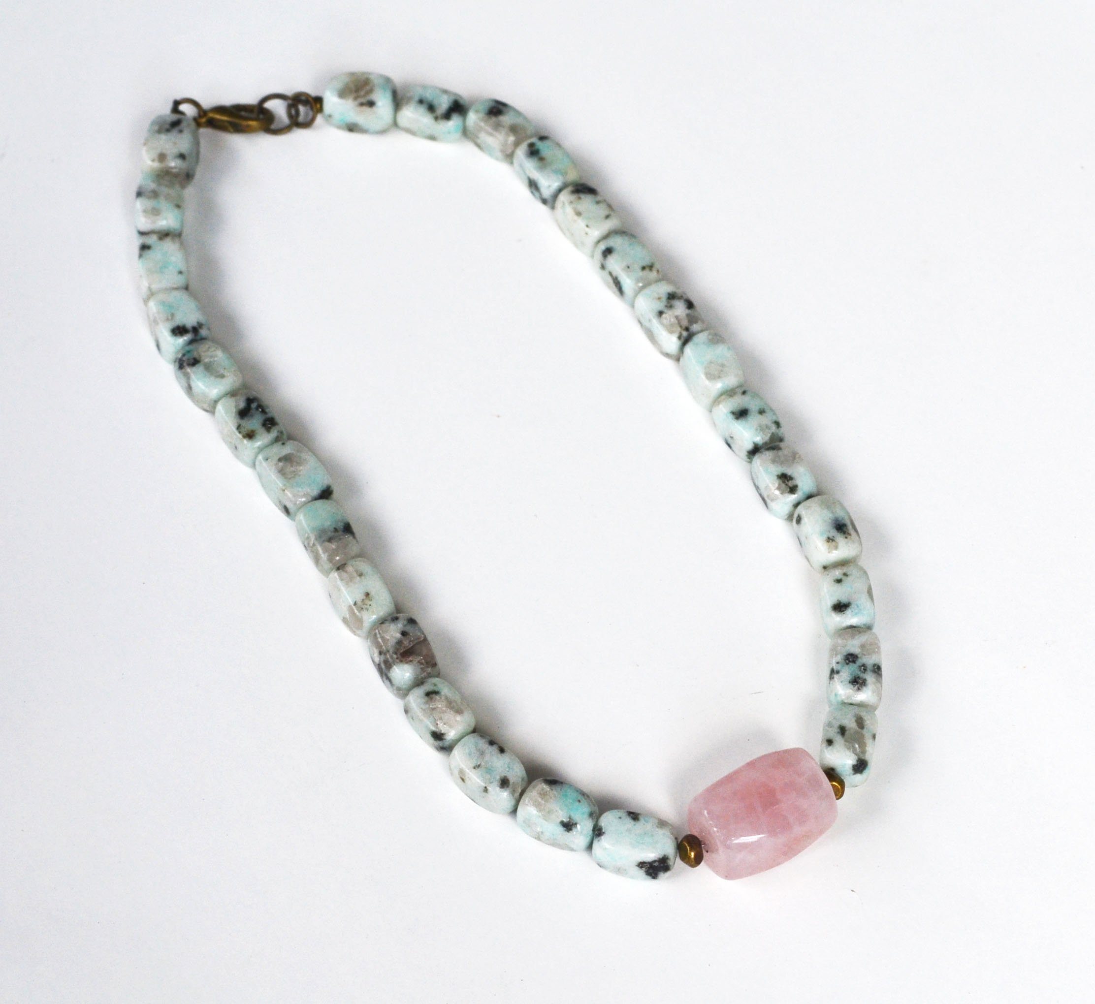 A short and chunky Dalmatian jasper necklace with a Rose quartz stone as the center piece. The mint and pink colors compliment each other very well and it will look great with many outfits. I have only 1 in stock.
