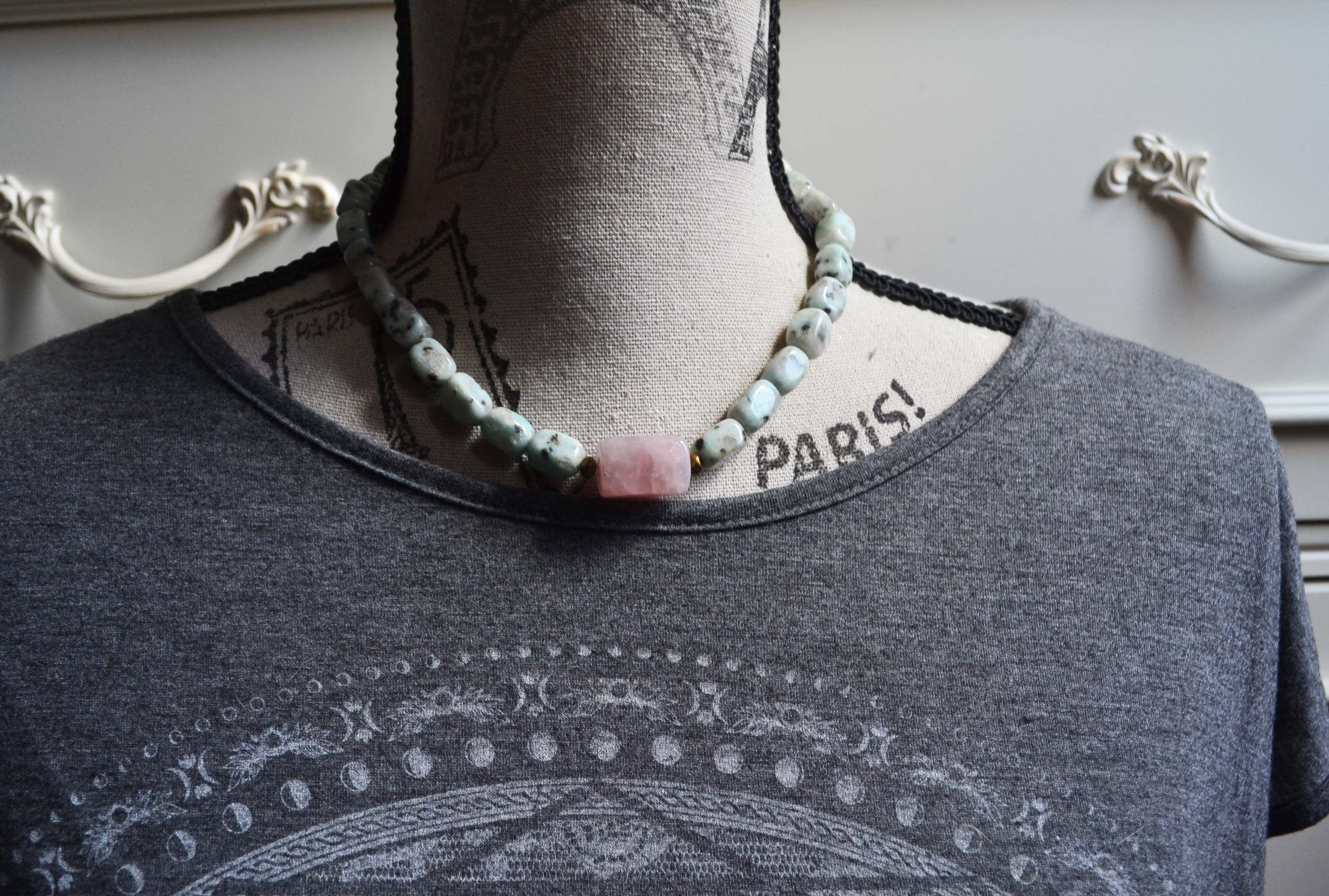 Rose Quartz and Jasper Necklace, Short Stone Necklace, Chunky Necklace, Gemstone Necklace, Pink and Mint, Christmas Gifts