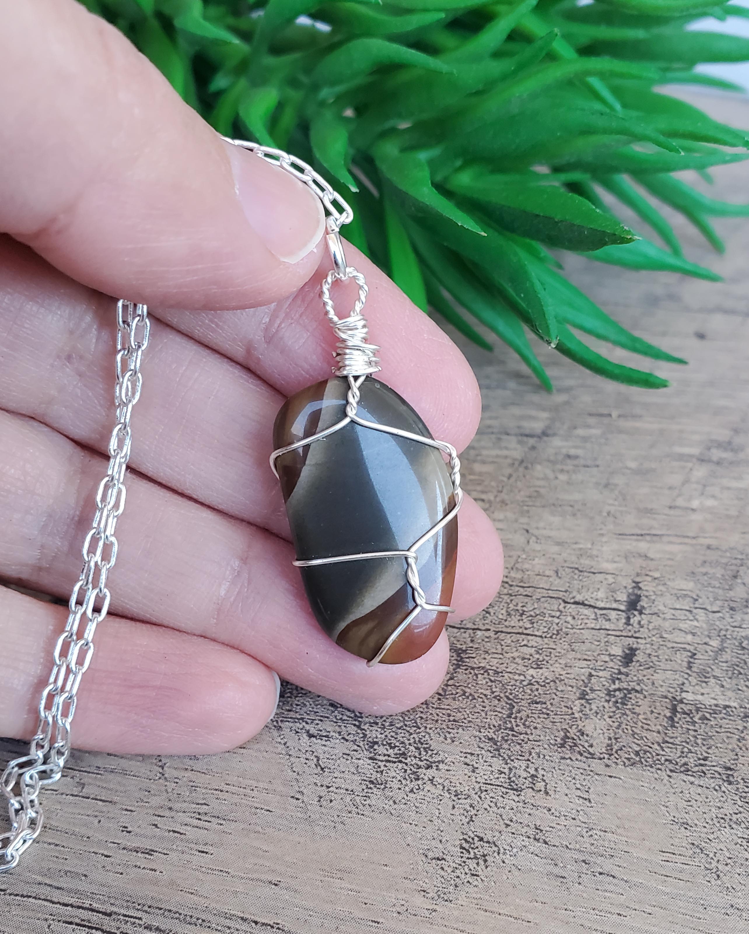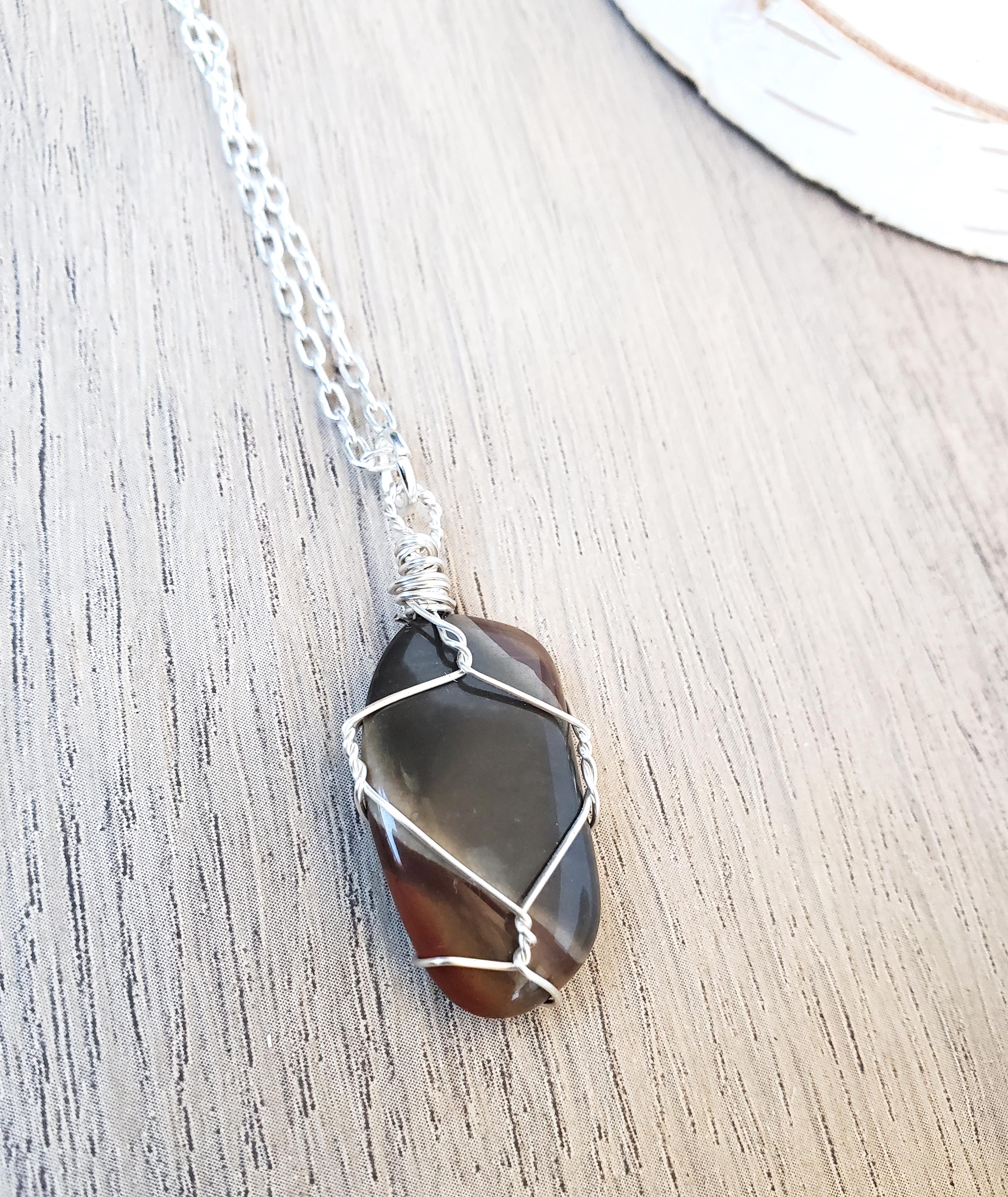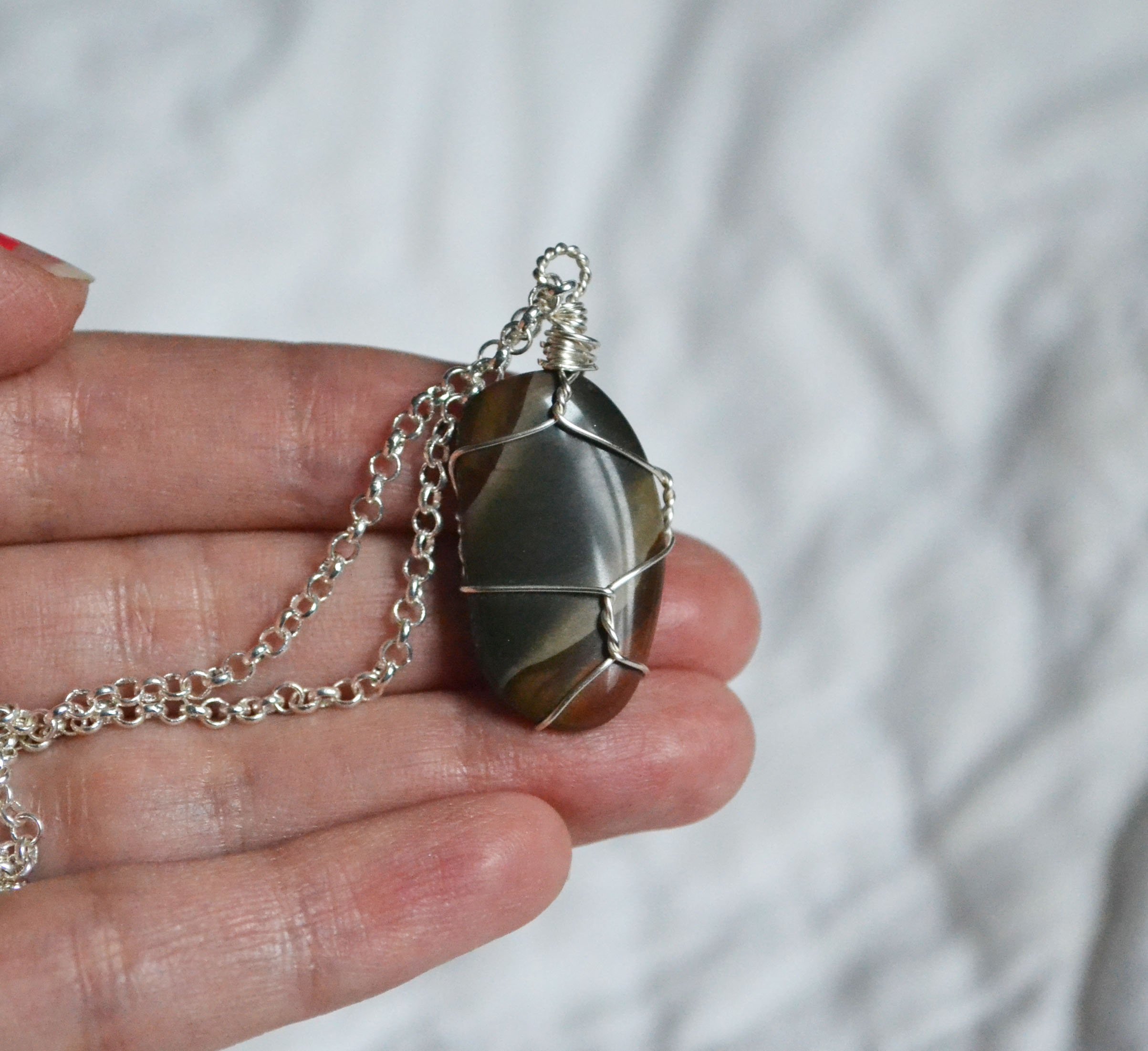 Jasper polychrome stone necklace with lovely dark grey shades as well as some red wire wrapped and hung on a cord or chain. This unisex stone necklace will make a great accessory for Spring. Please view all of the photos and choose a silver plated chain or black cotton cord at checkout.