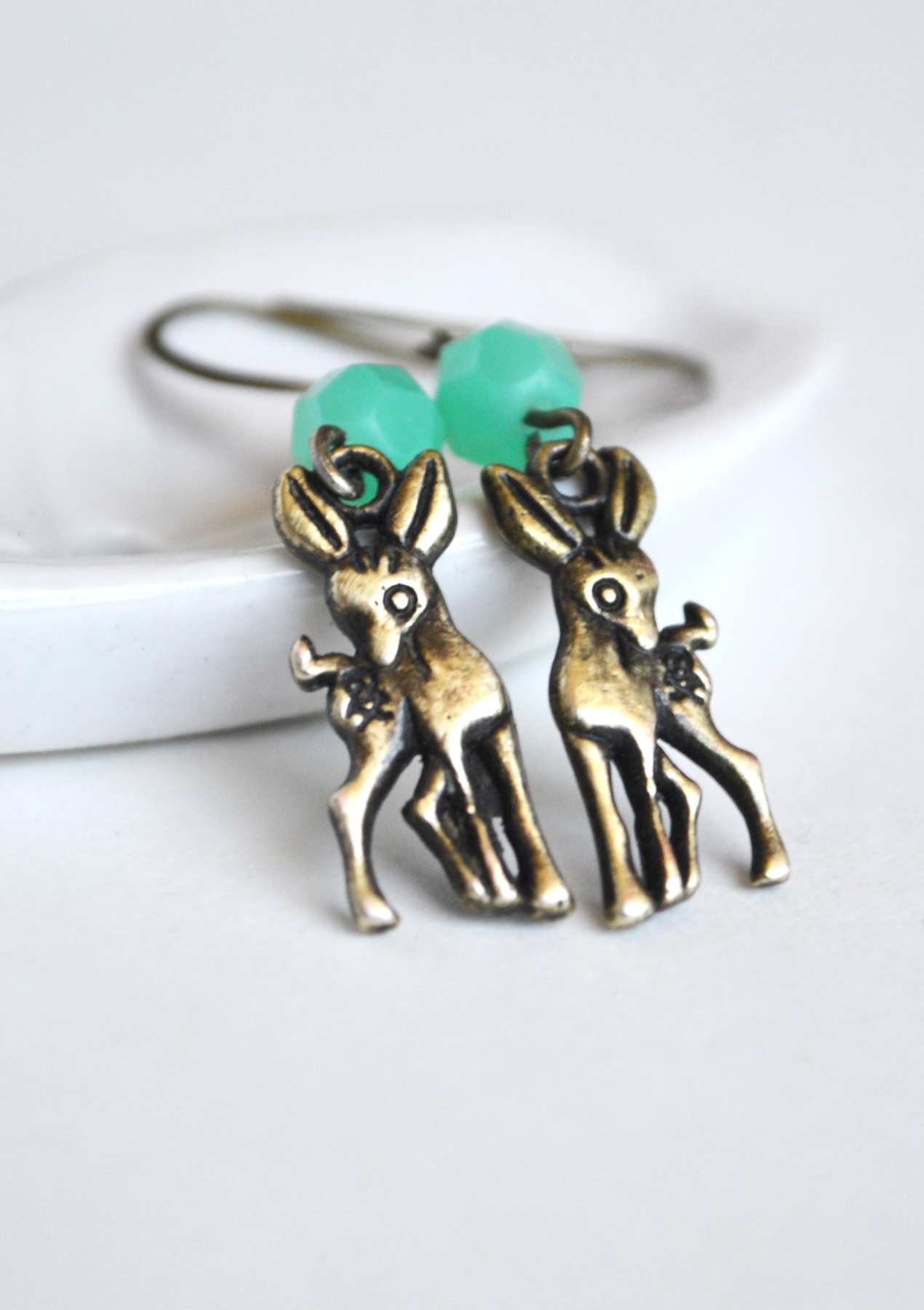 Deer Earrings, Fawn Earrings,Wildlife,Camping,Seafoam Czech Beads