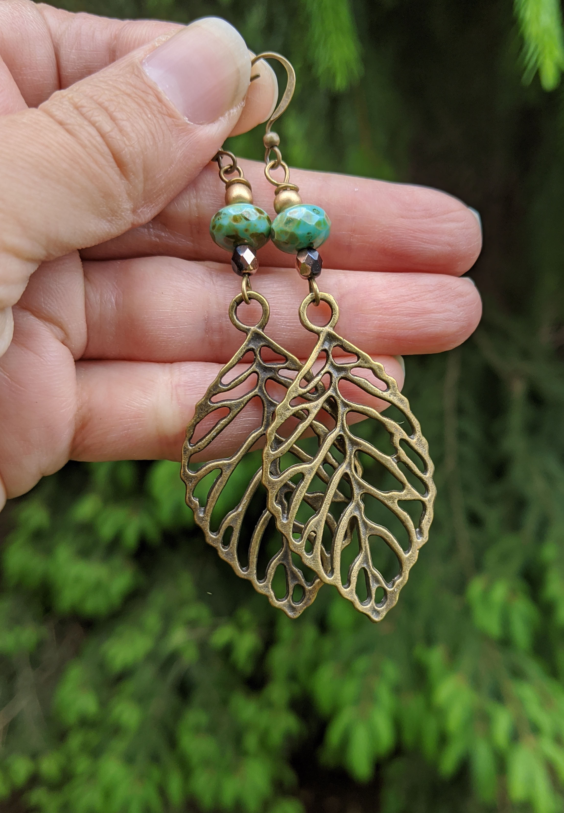 Long boho inspired leaf earrings that are perfect for the Spring and Summer. These earrings are lightweight and so pretty. Please view all of the photos