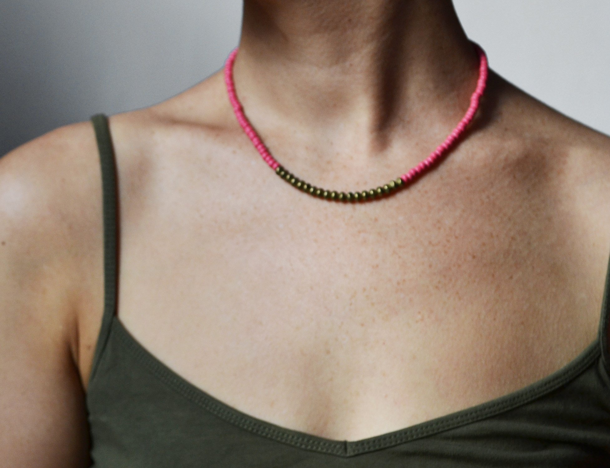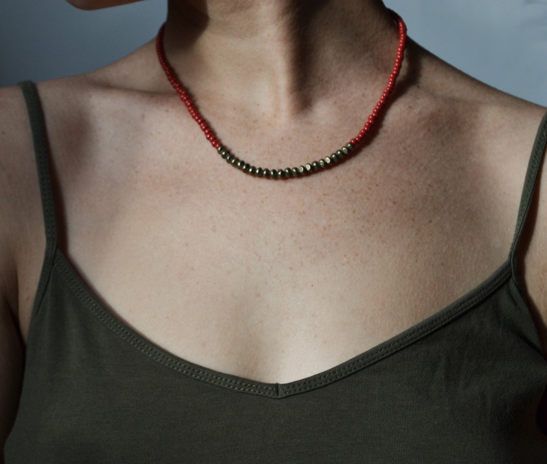 This Ravishing Red geometric seed bead necklace comes with brass beads as the center focal. This minimal clean look goes great with many outfits. View all photos and see a pink version in my shop.