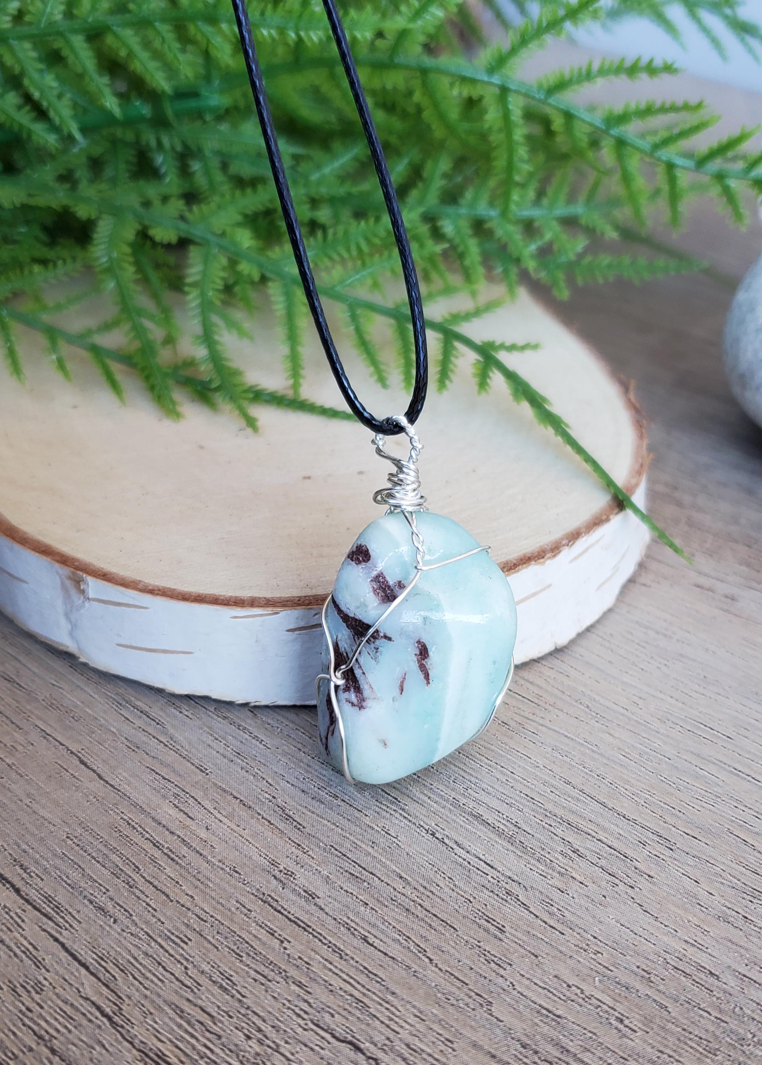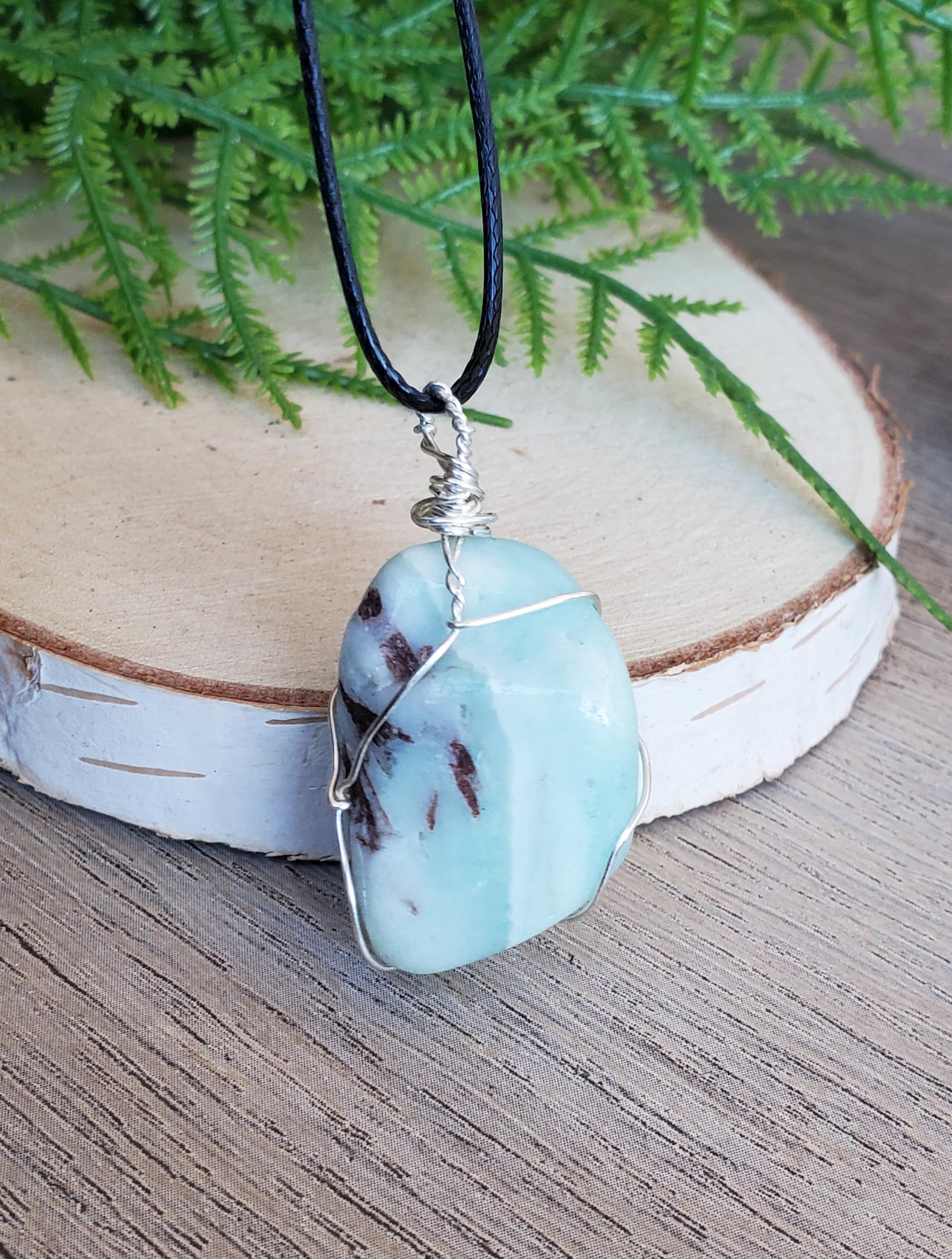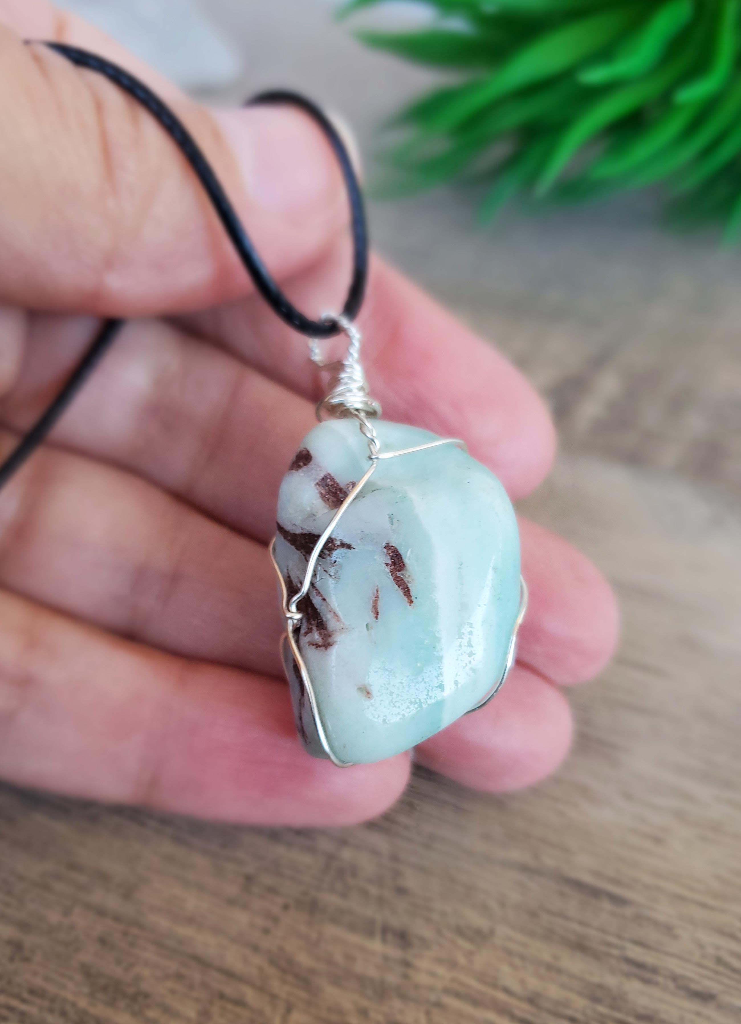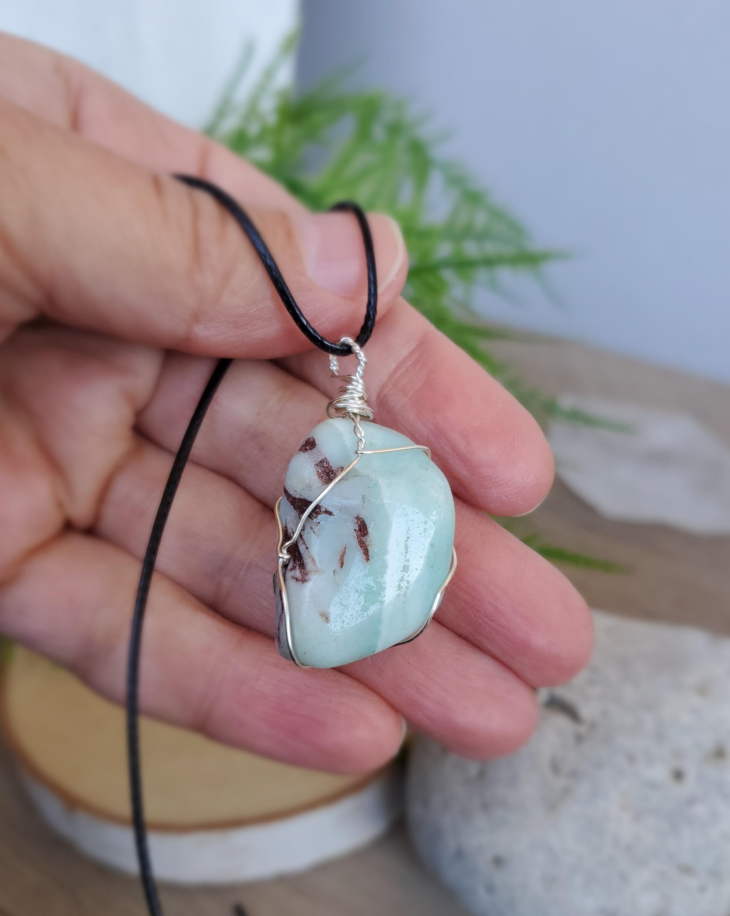 A lovely soft blue green Amazonite tumbled stone wire wrapped in silver plated wire and hung on a silver plated chain or black cotton cord. Please view all of the photos for the details and choose the chain length at checkout.