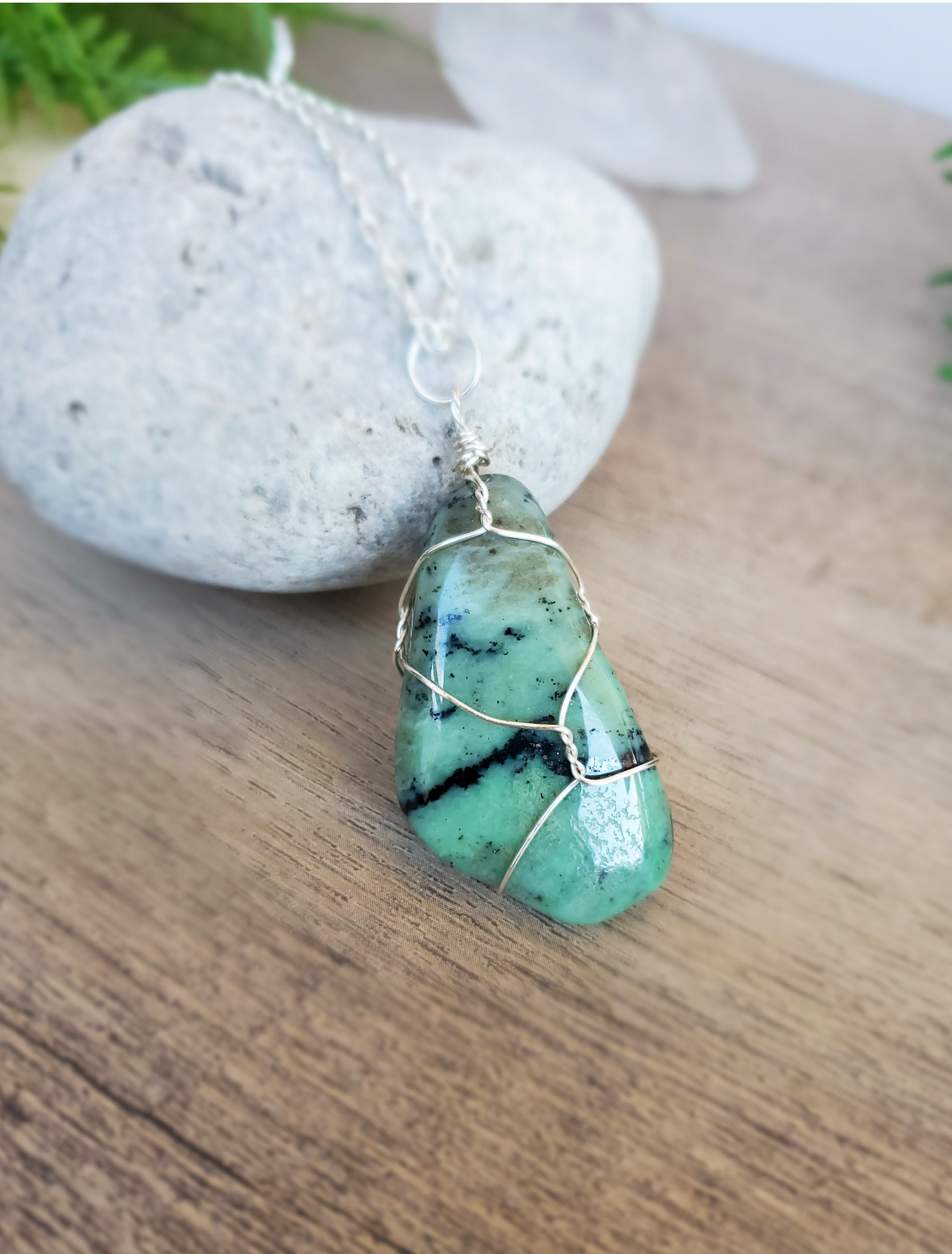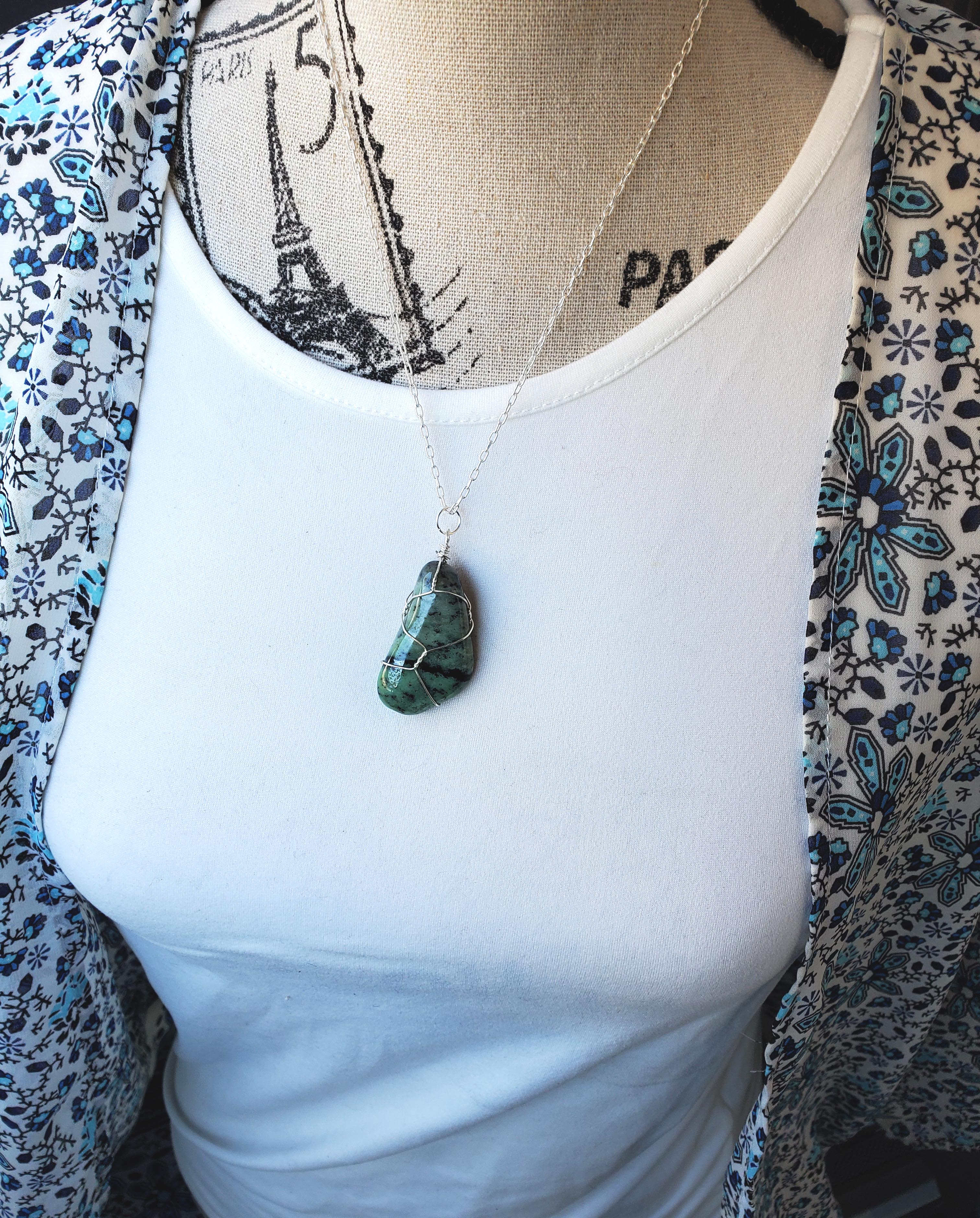 Green BC Jade Necklace, Green Stone Necklace for Spring, Long Tumbled stone Necklace, Dendrite stone, Wire Wrap Crystal Necklace Canadian Shop