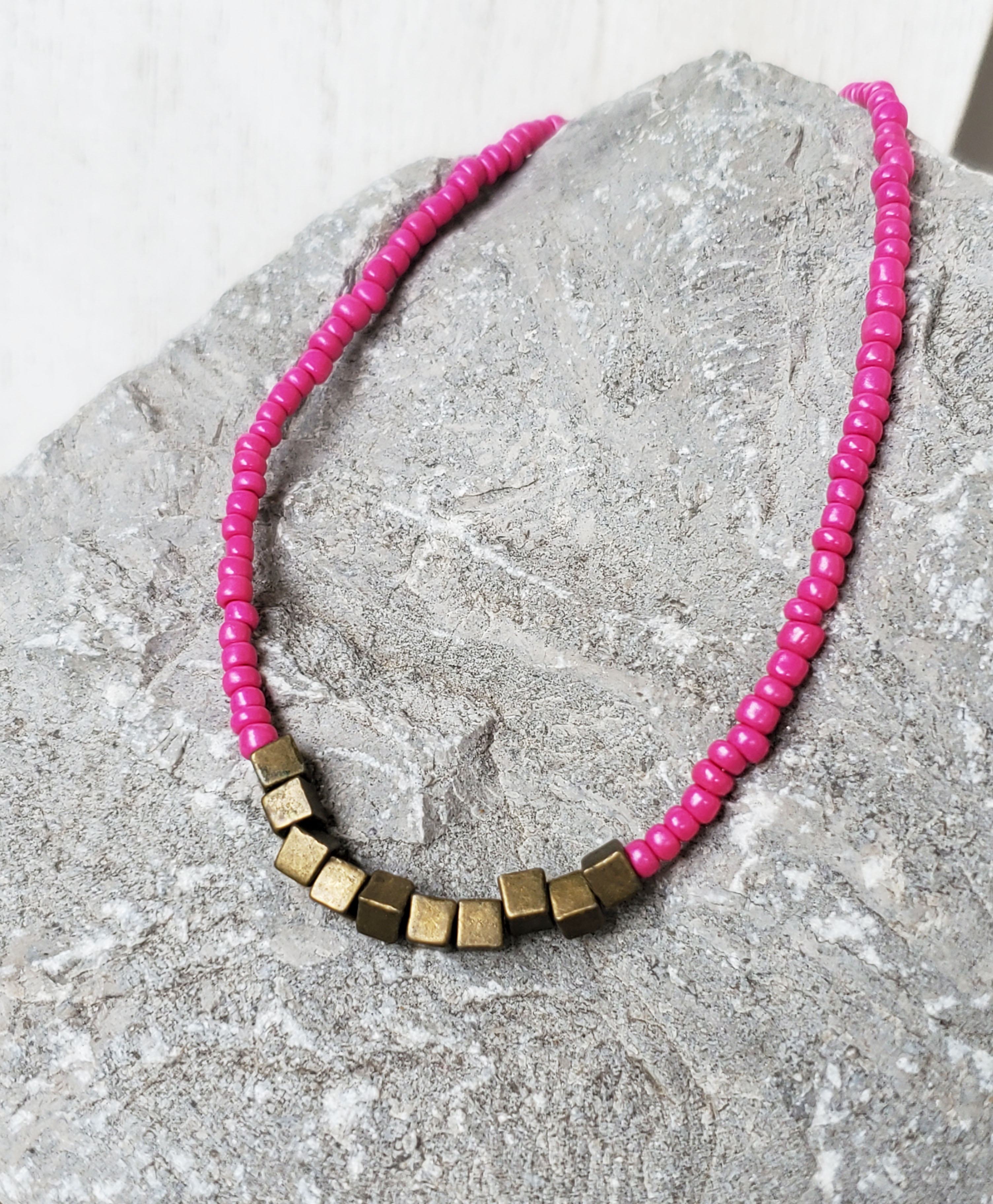 A pretty pink beaded necklace with brass square beads that can be worn with many different outfits. This necklace is strand on a sturdy wire and has a lobster clasp for closure. Please view all of the photos for details.