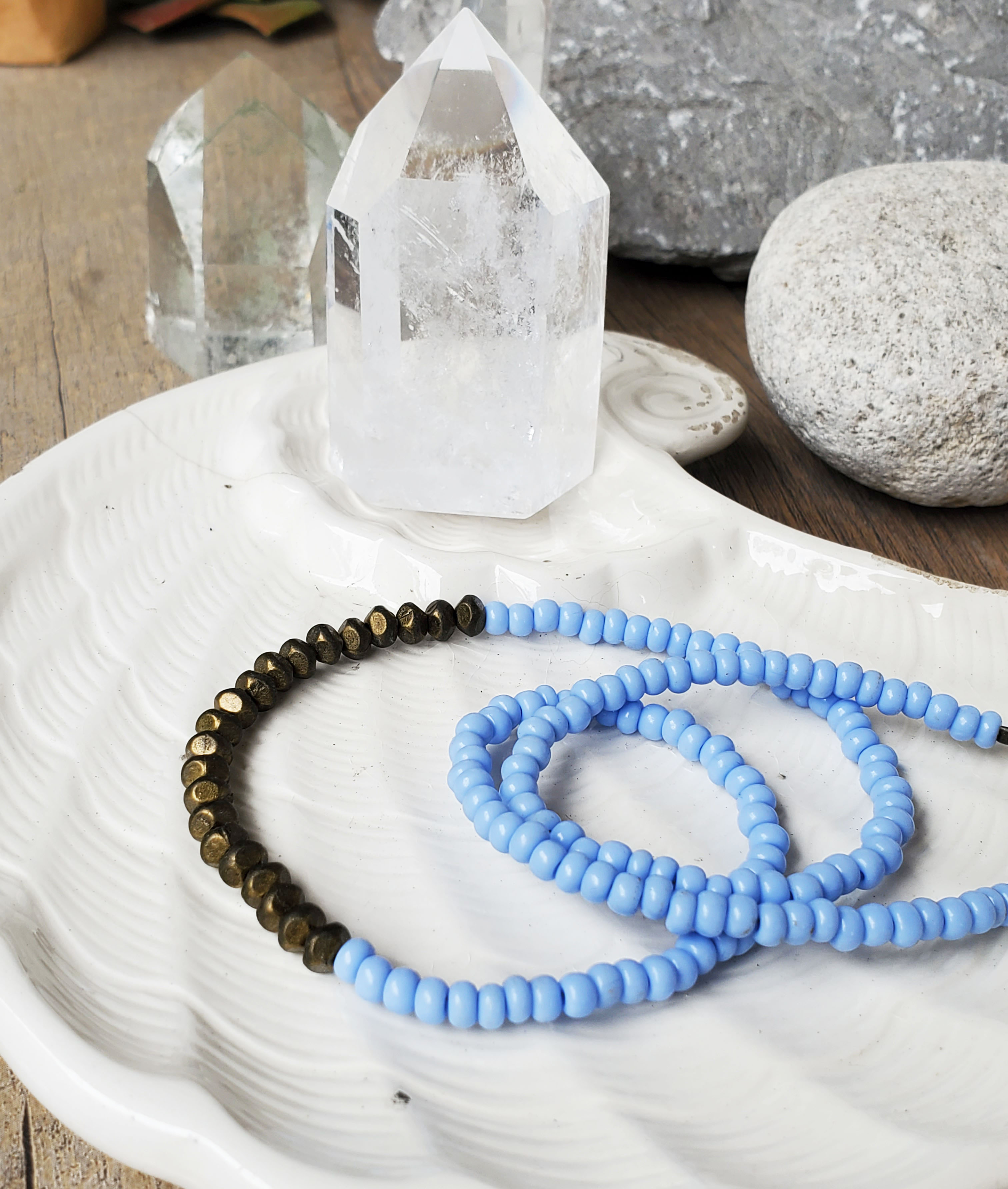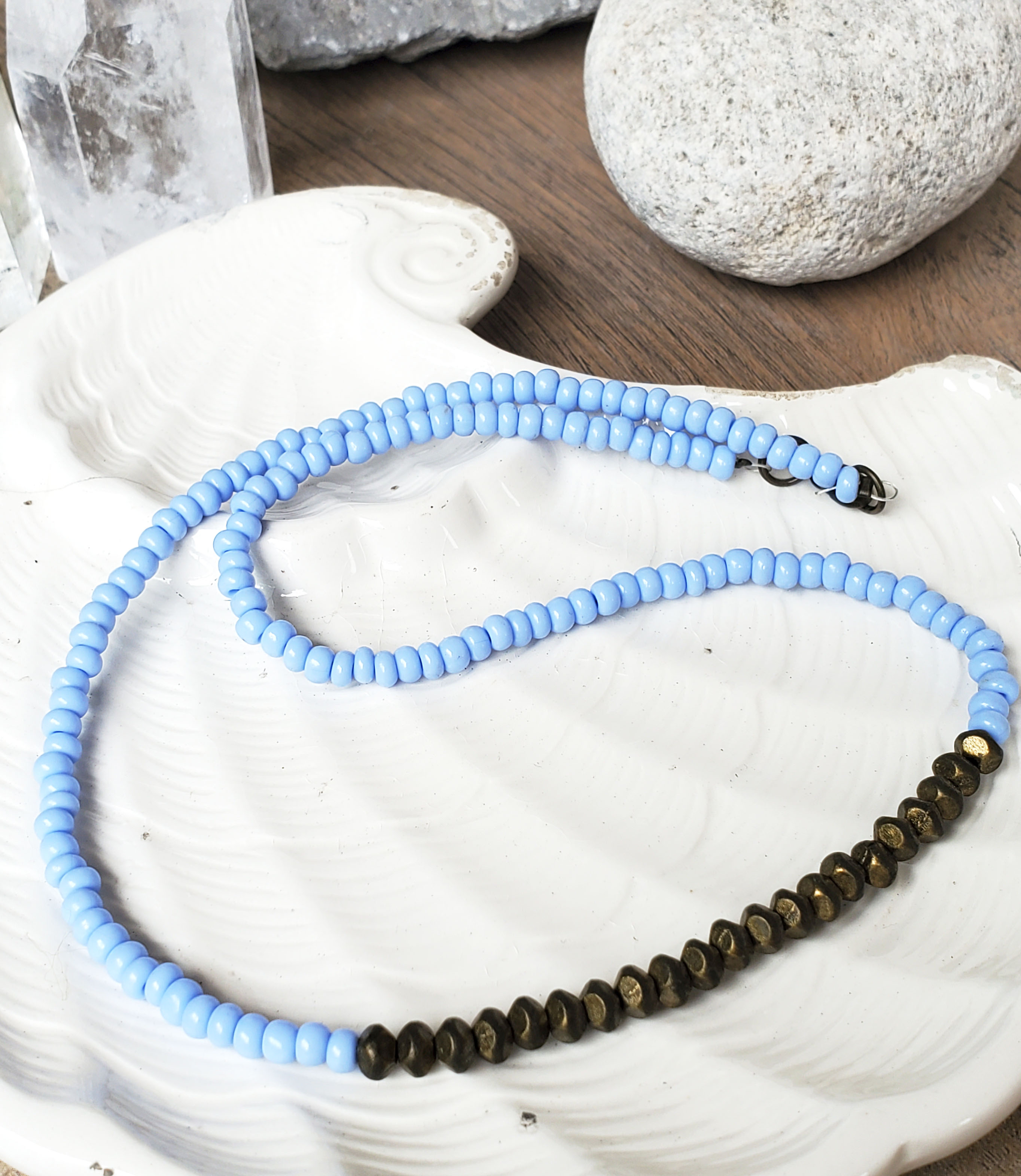 Blue Beaded Necklace, Short Bead Necklace, Back to School Necklace, Beaded Jewelry for Everyday, Brass beaded Necklace