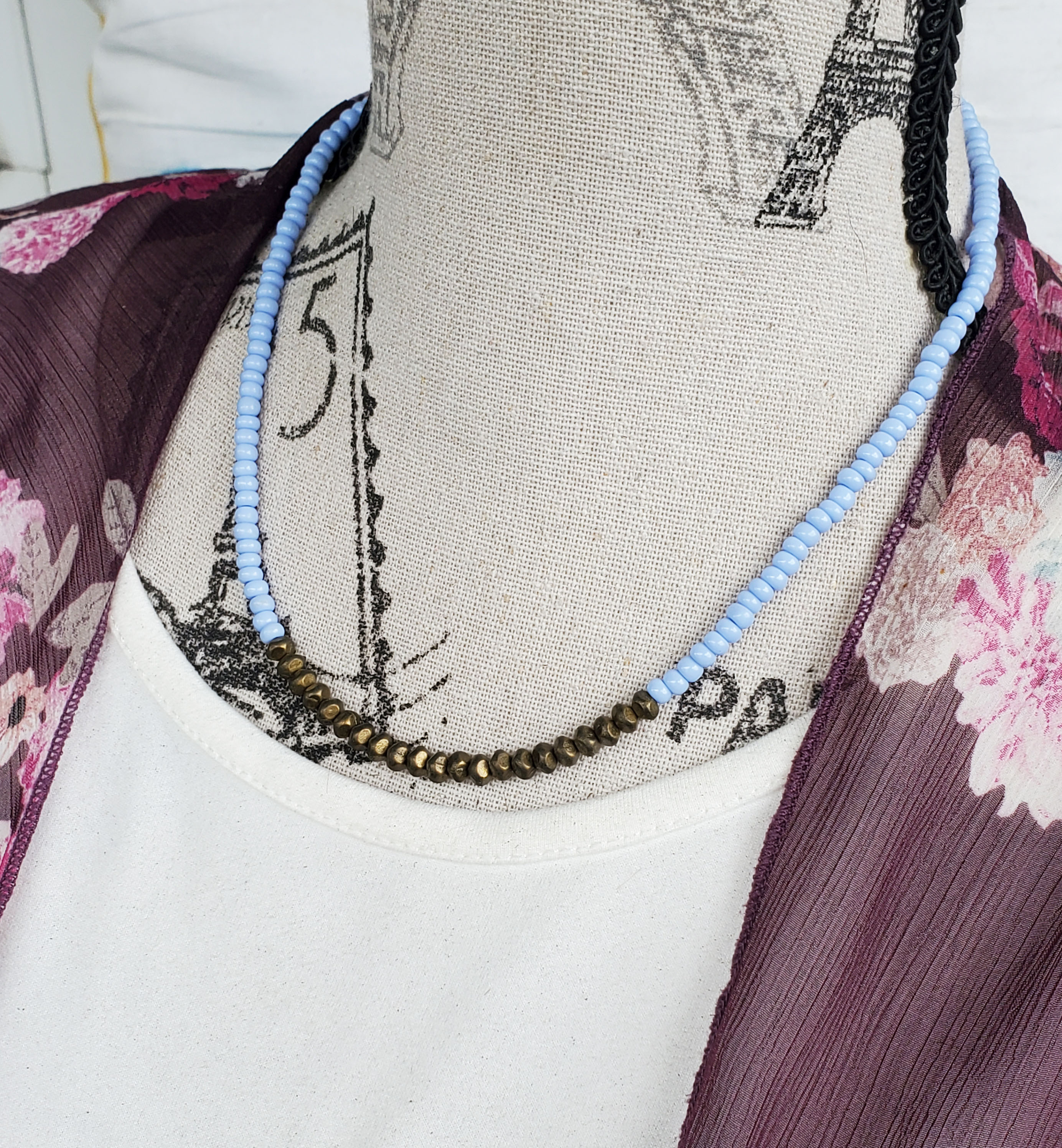 A cute light blue beaded strand necklace with brass beads. This necklace is 18 inches long and has a lobster clasp for closure. Wear it with many different outfits. Please view all of the photos for details.