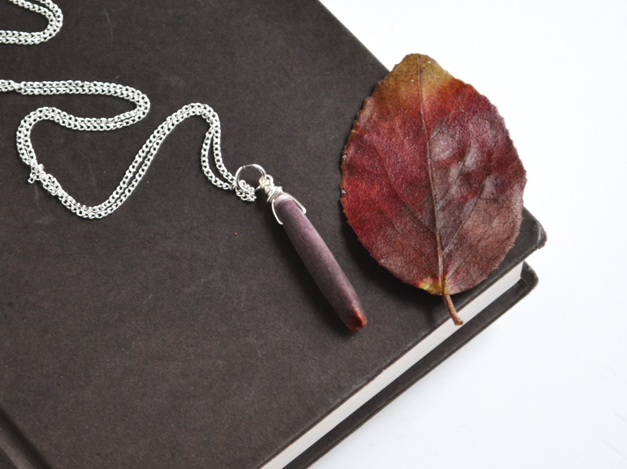 This beautiful dark purple sea urchin stick has a tinge of dark orange at the bottom of it. I have wire wrapped the top with tarnish free silver plated wire and it comes with a long silver plated chain.
