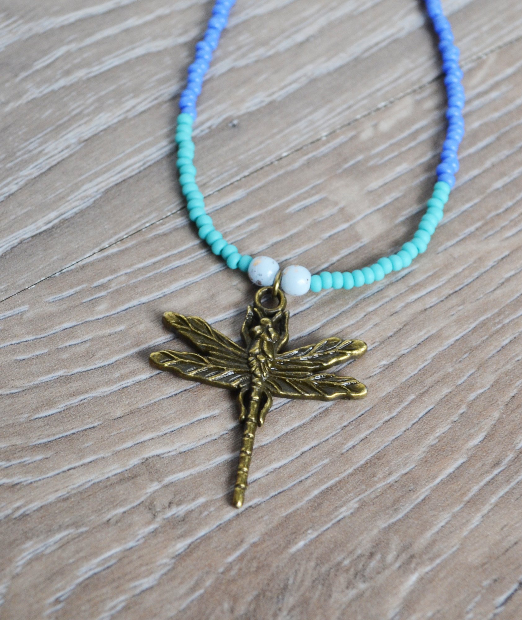 The dragonfly reminds me of summertime, and this brass charm is the perfect size for this dainty beaded necklace. Please view all photos.