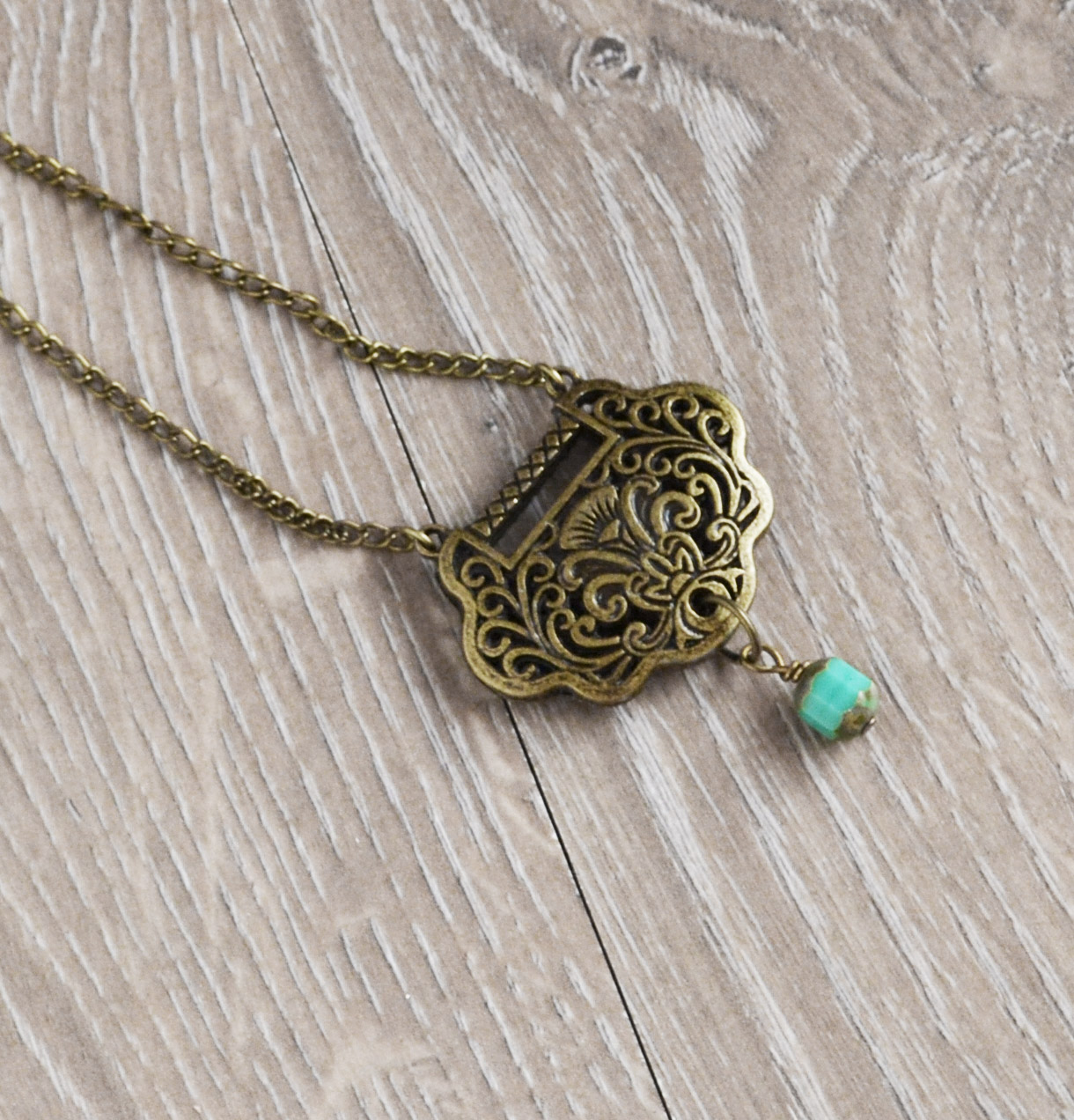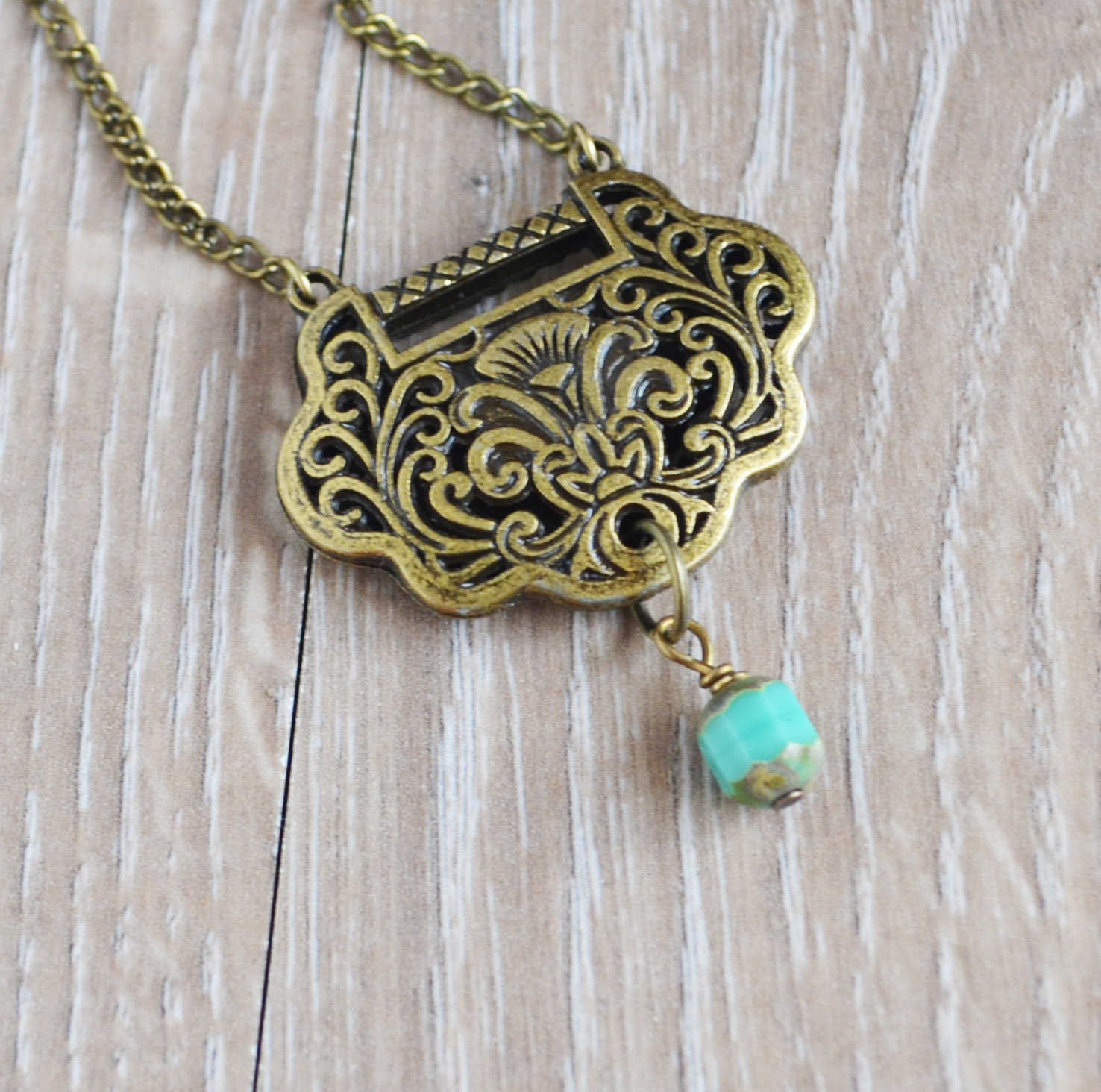 This art nouveau inspired piece has a pretty intricate ornate front and a turquoise czech glass bead. It comes on a brass chain and please view all photos.