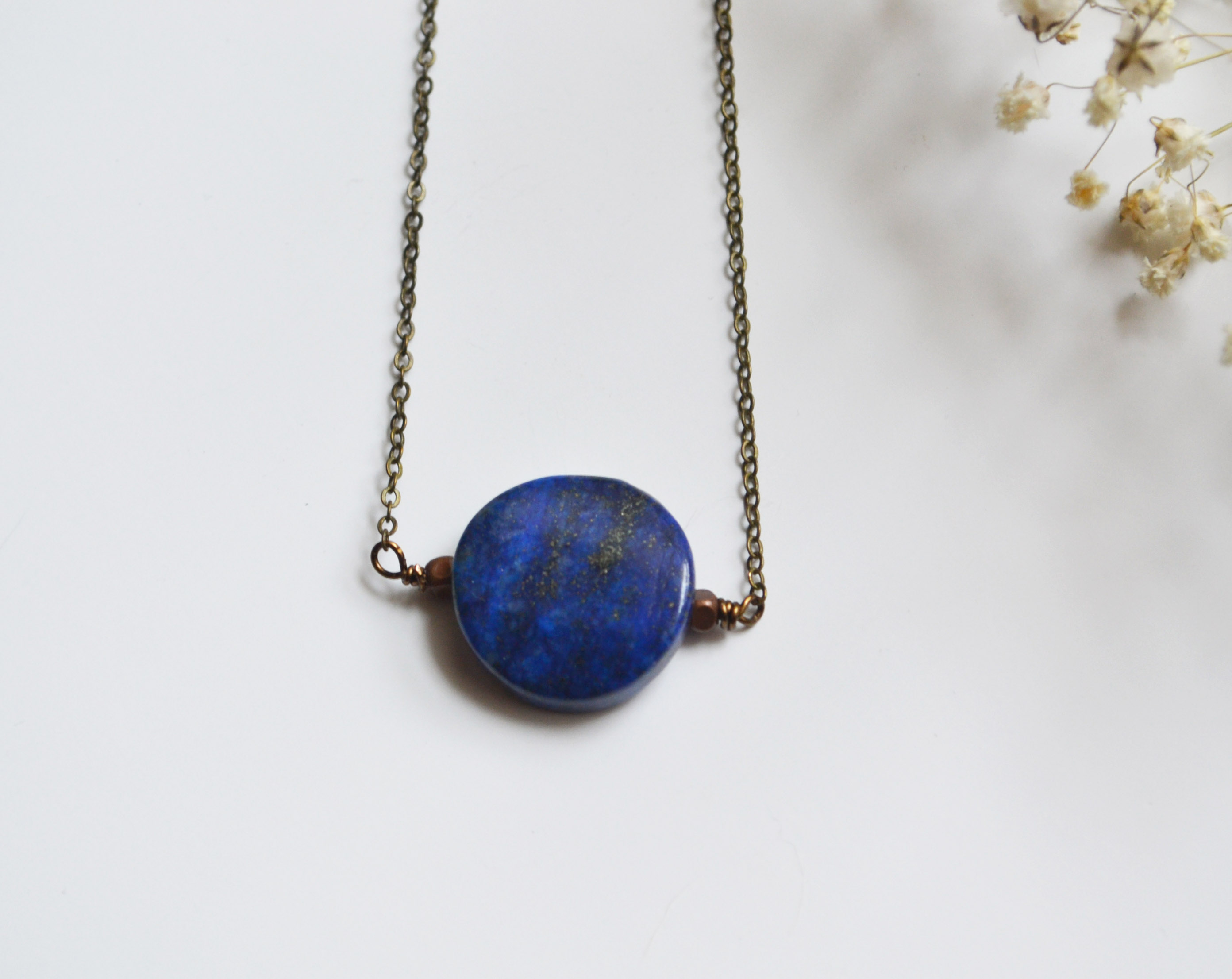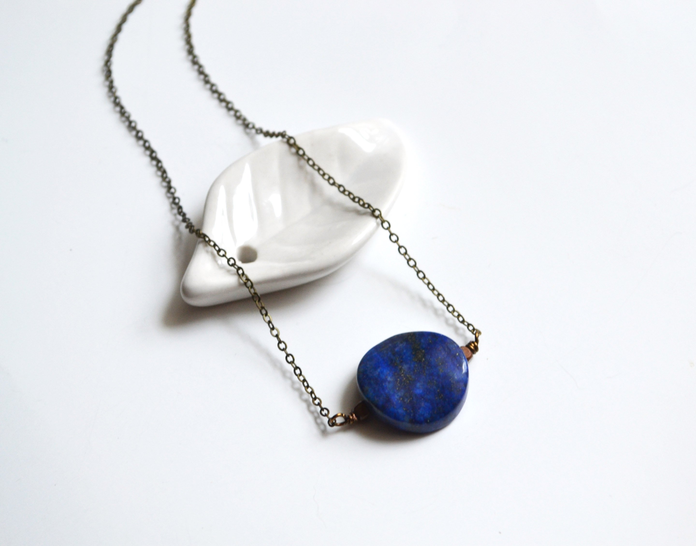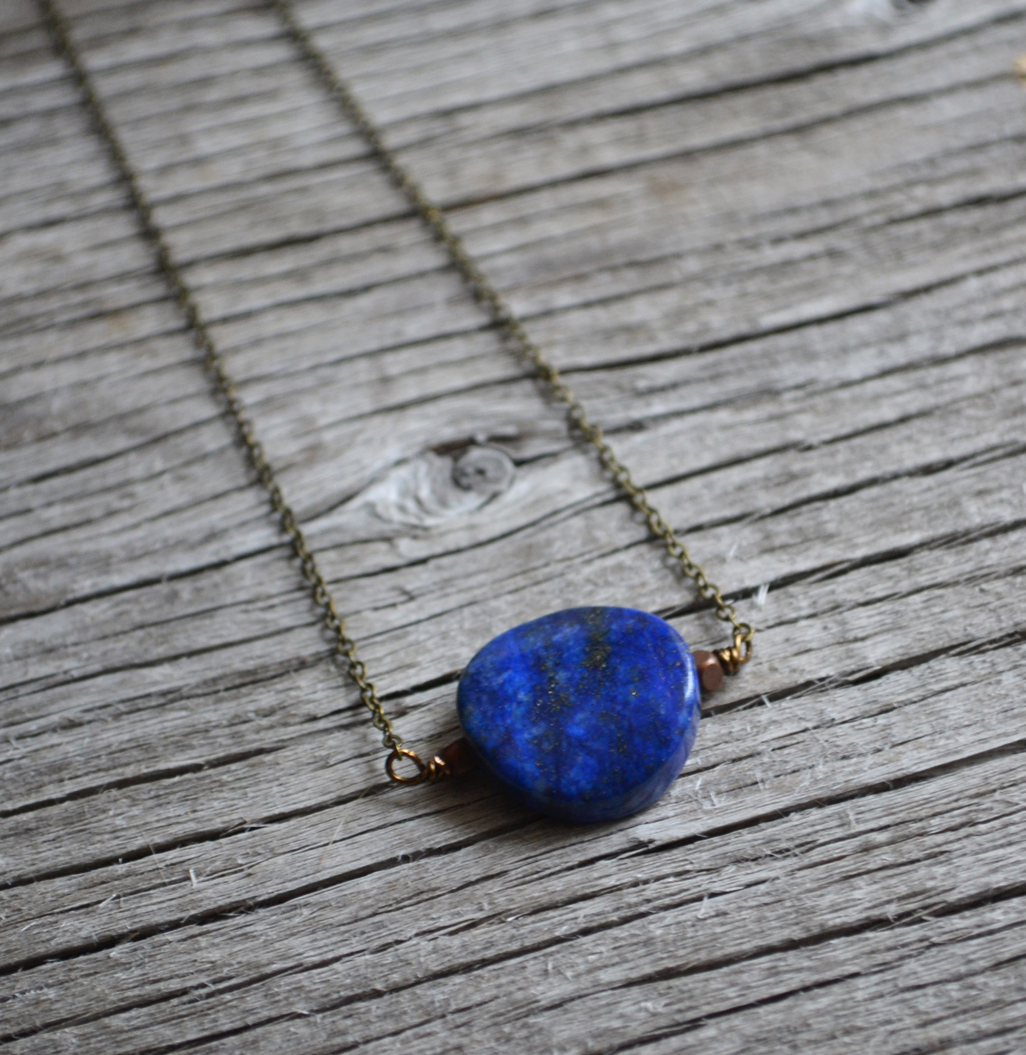 This lapis stone necklace comes with copper metal beads and a delicate brass chain. I love the color of lapis stones because of the dark navy color and the flecks of gold with in the stone.