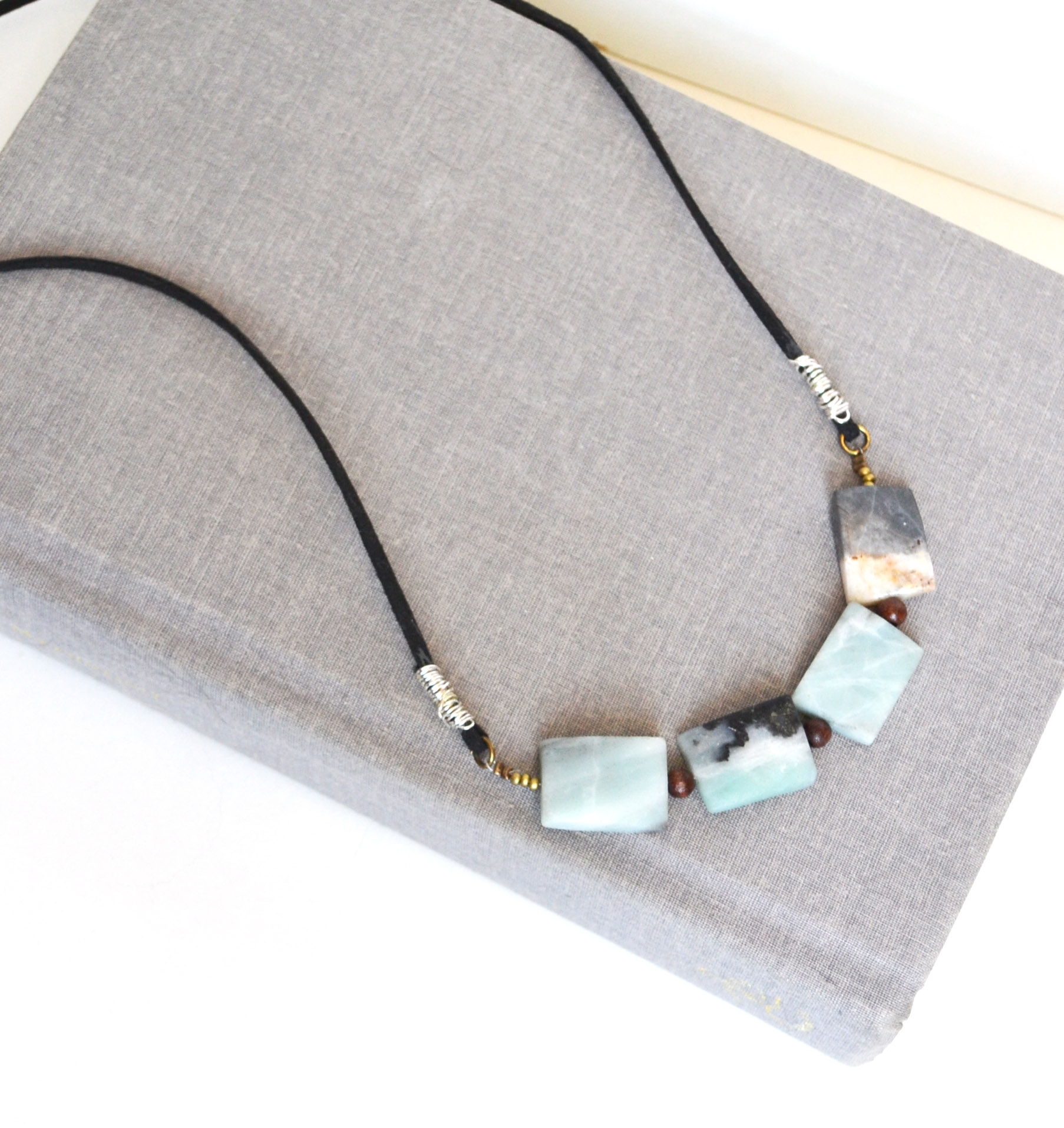 This lovely Amazonite necklace has a natural earthy look to it. I have picked four unique stones with lovely shades and added wood beads to separated each stone. They hang from brown suede cord that is wire wrapped for an raw earthy look. It comes with a lobster claw clasp. If you need it a bit longer, let me know in a note at checkout. Please view all photos.