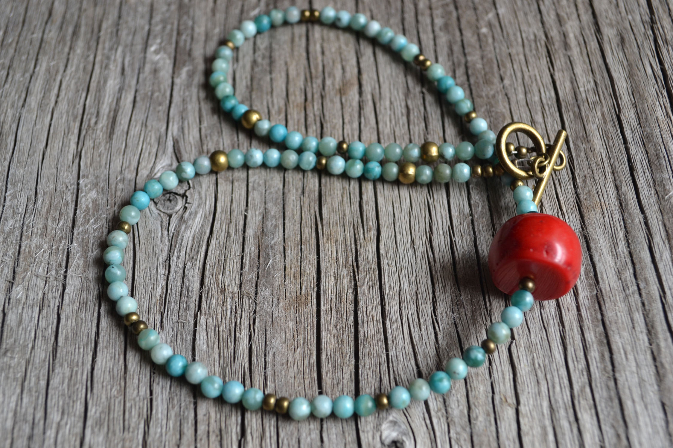I love coral, it reminds me of the summer and the beach. I have added one coral center piece to a smaller strand of pale blue agate stones. This short statement necklace makes for a fun summer piece, and I have added a brass toggle clasp for easy wear. View all photos for details.