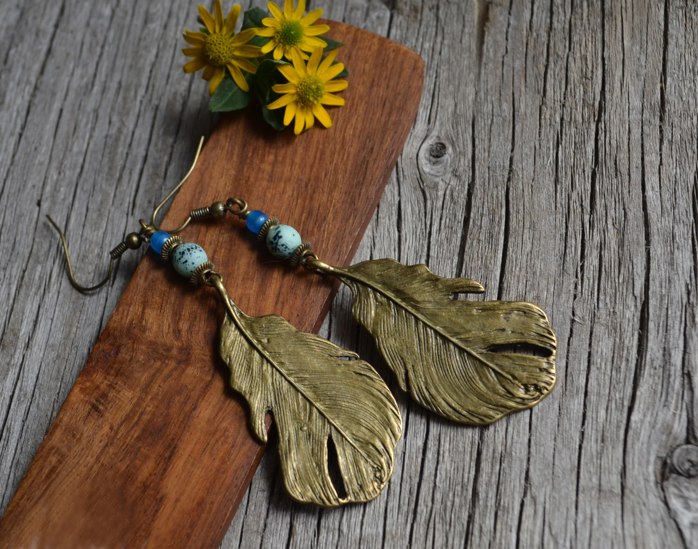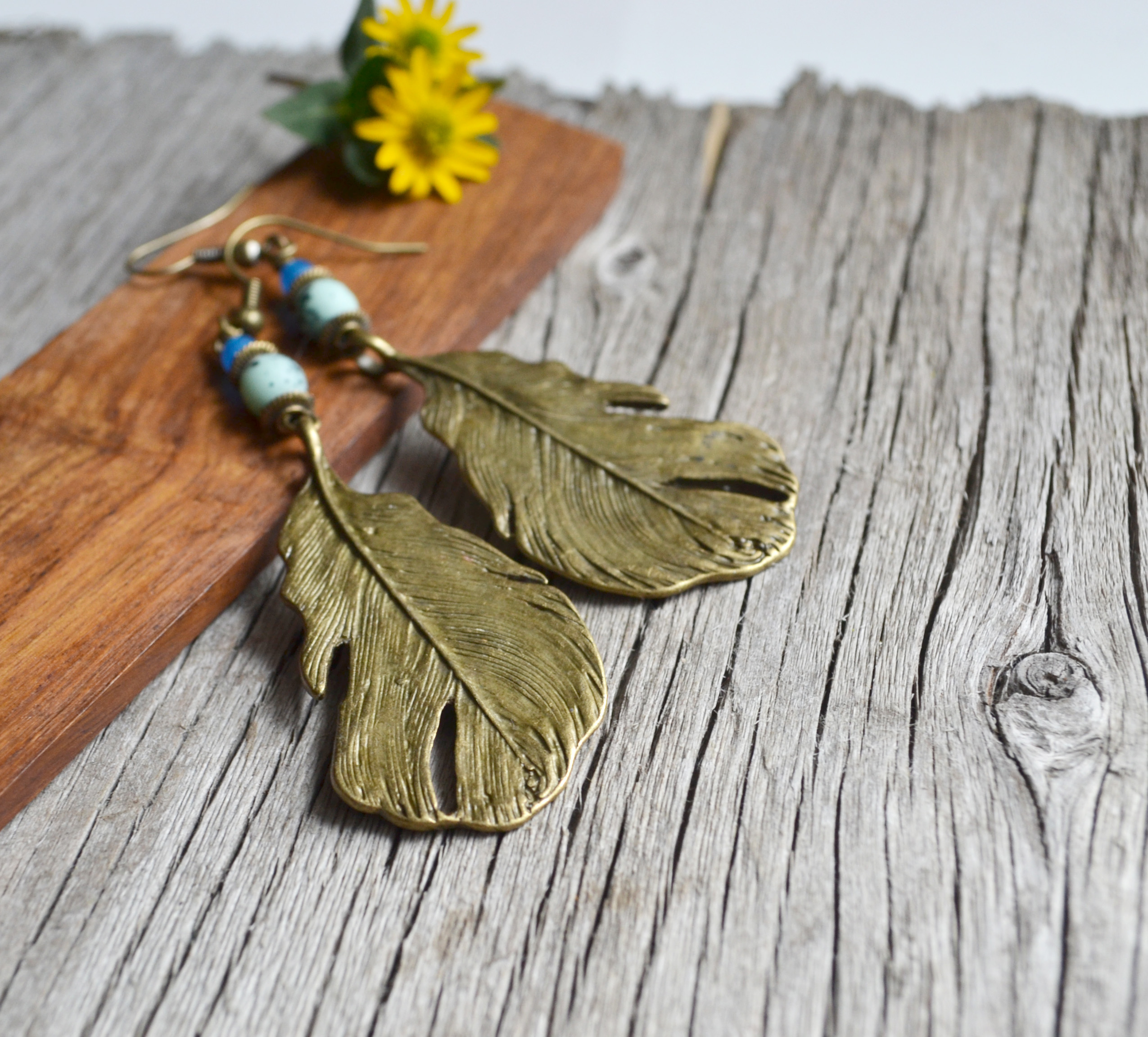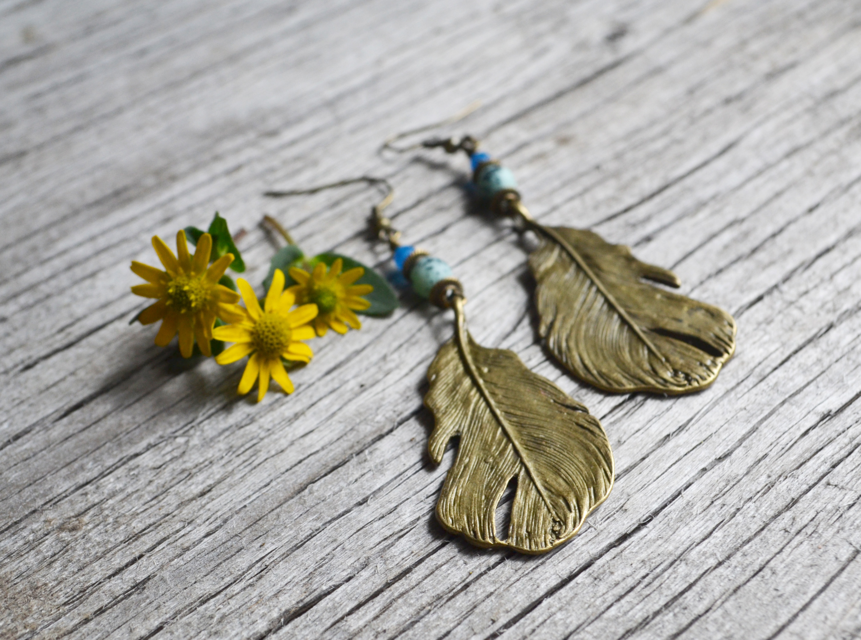 These gorgeous feathers have been paired with one spotted minty blue bead and one sea blue czech bead. There are also two disk brass findings as accent beads. These are long boho earrings great for a long flowing dress or blouse.