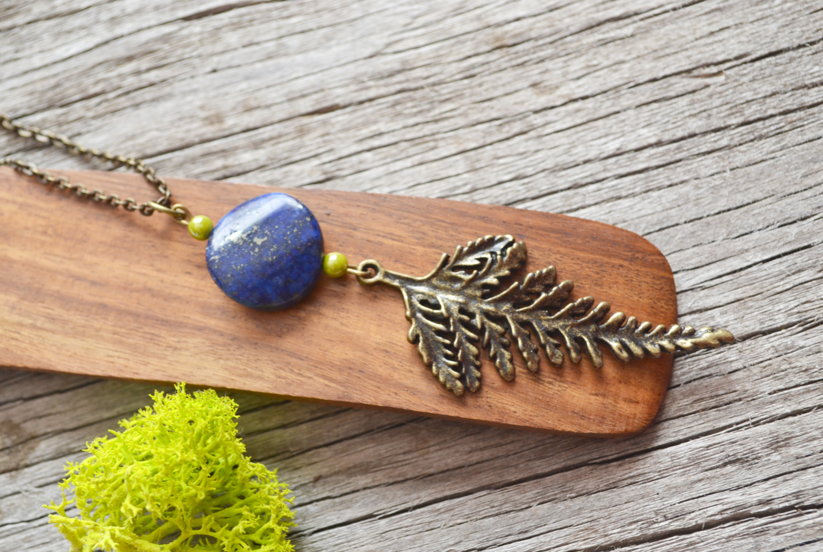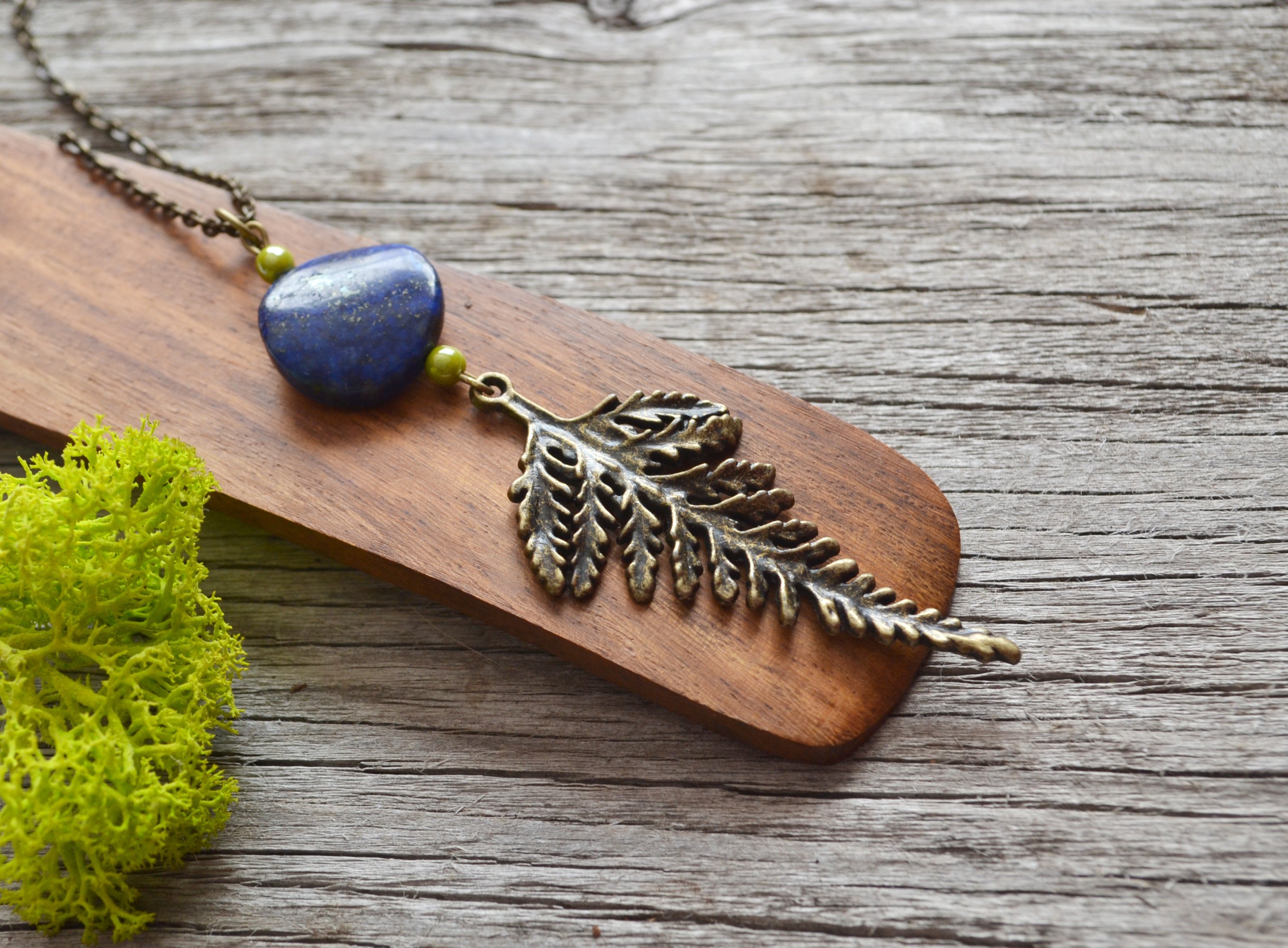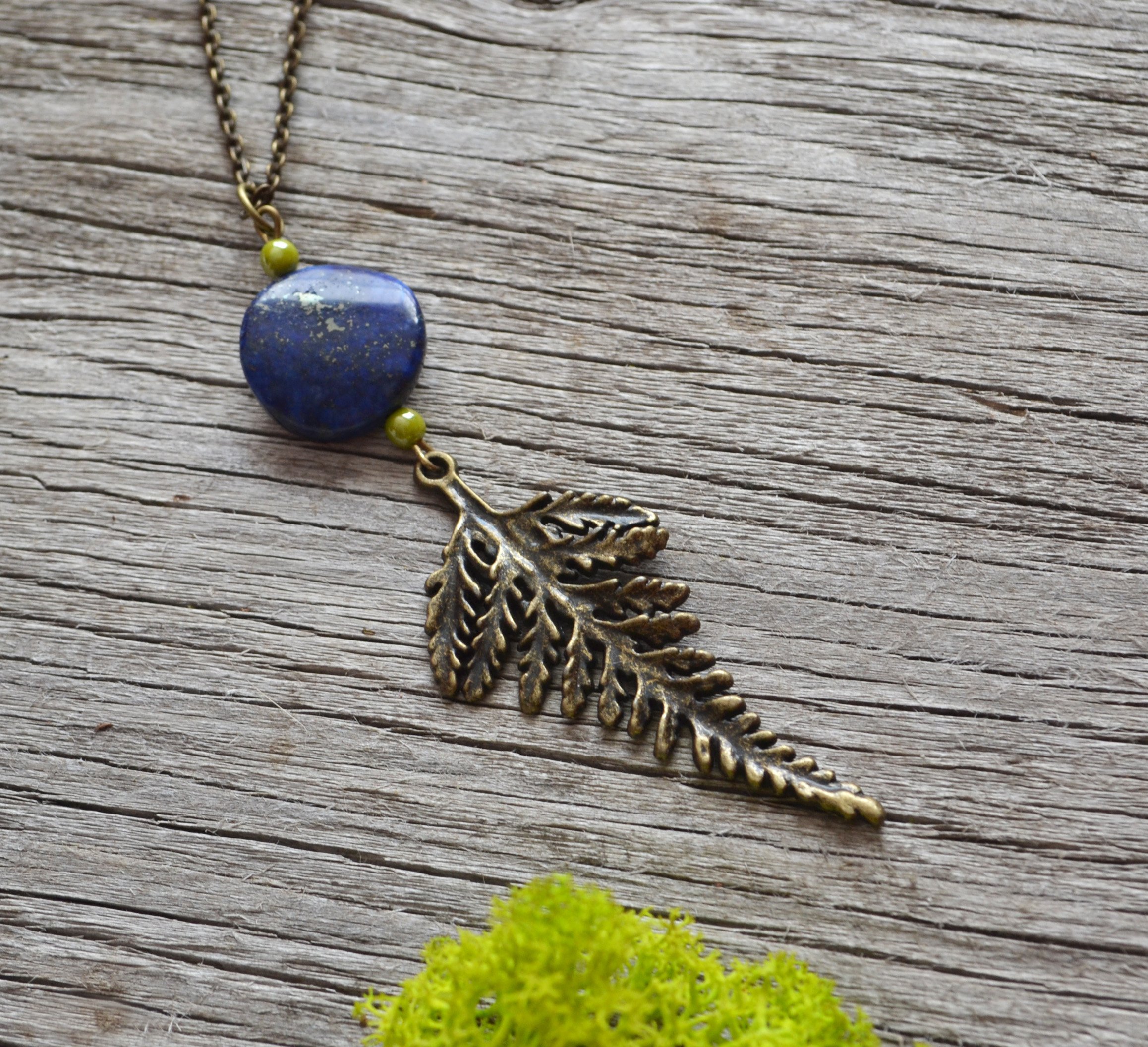 I have paired this lovely brass fern charm with a gorgeous blue lapis lazuli stone. The stone is a navy blue with gold flecks. Above each stone I have added two olive green Czech glass beads for contrast. This necklace looks best on a long chain giving it a bohemian feel. If you need another length let me know. Please view ALL photos for details.