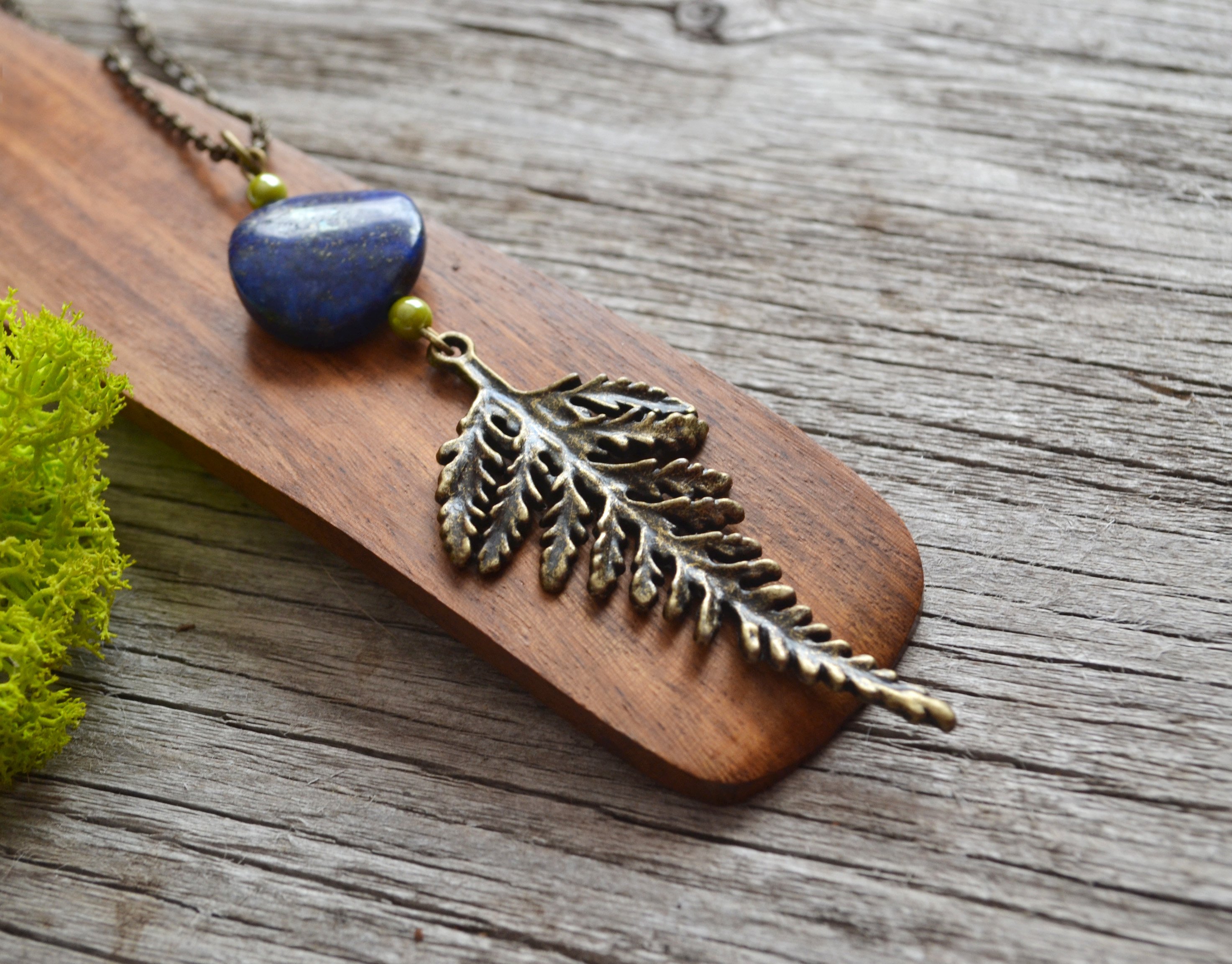 Fern Necklace, Fern Charm, Forest Jewelry, Lapis Stone, Nature Lover, Long Chain