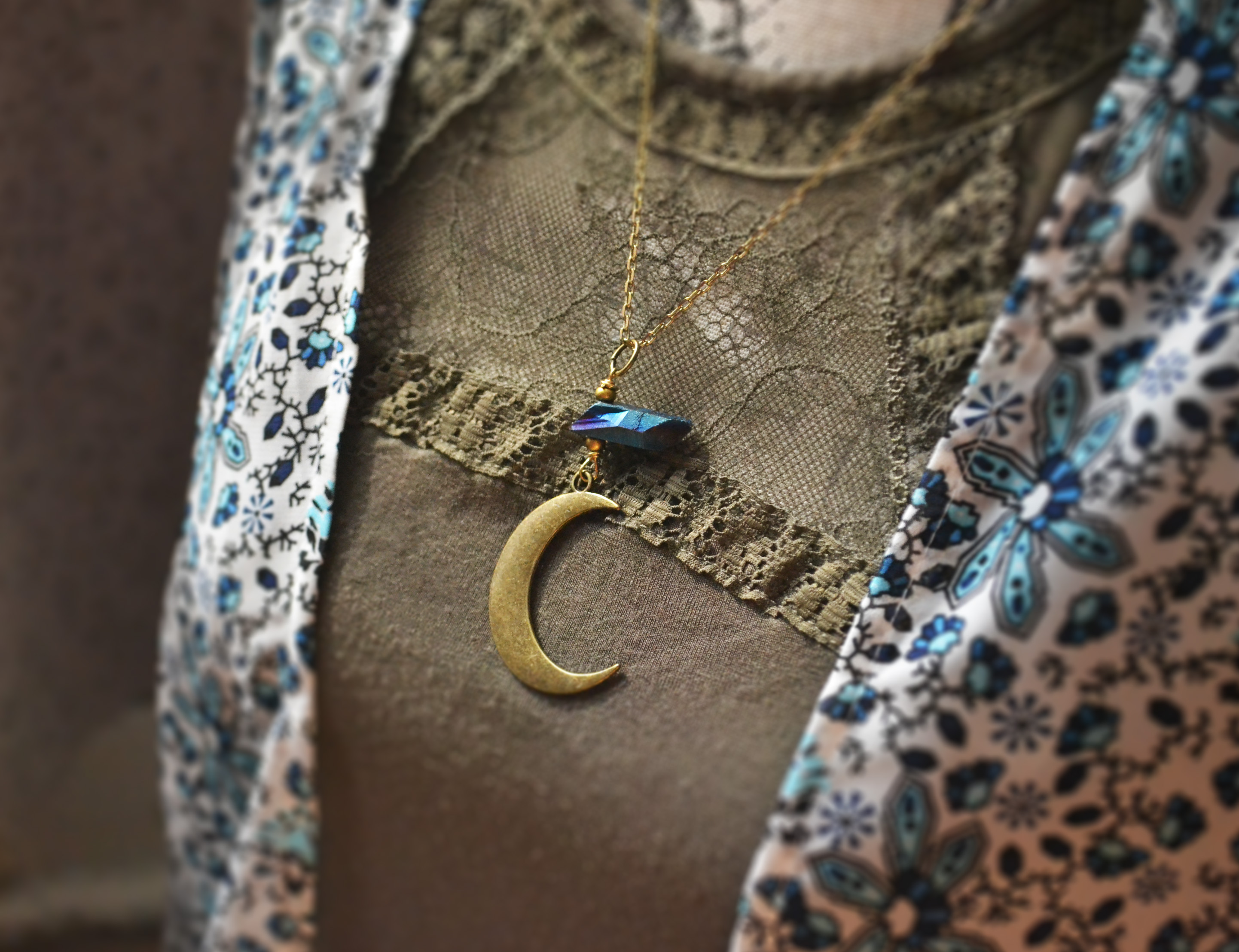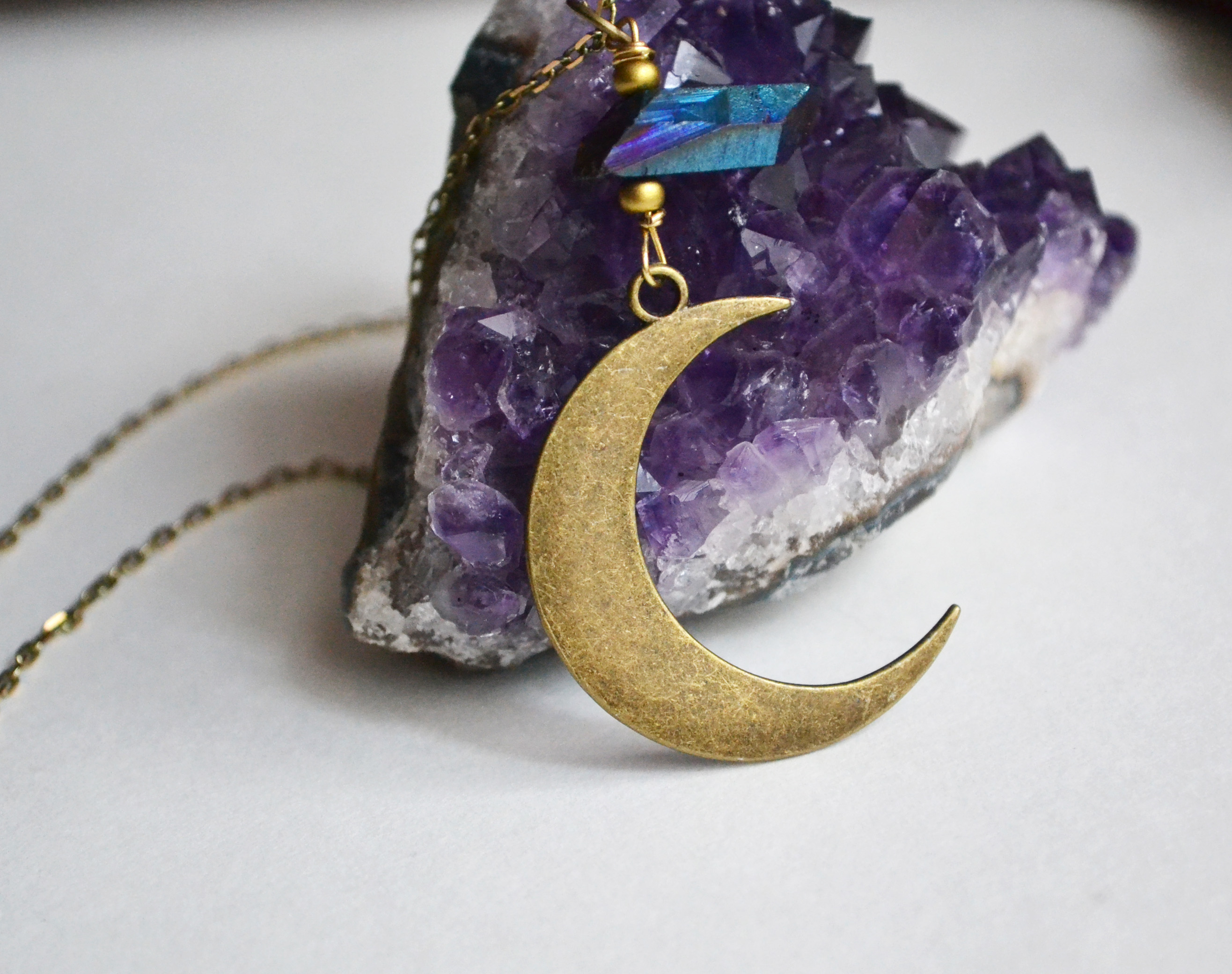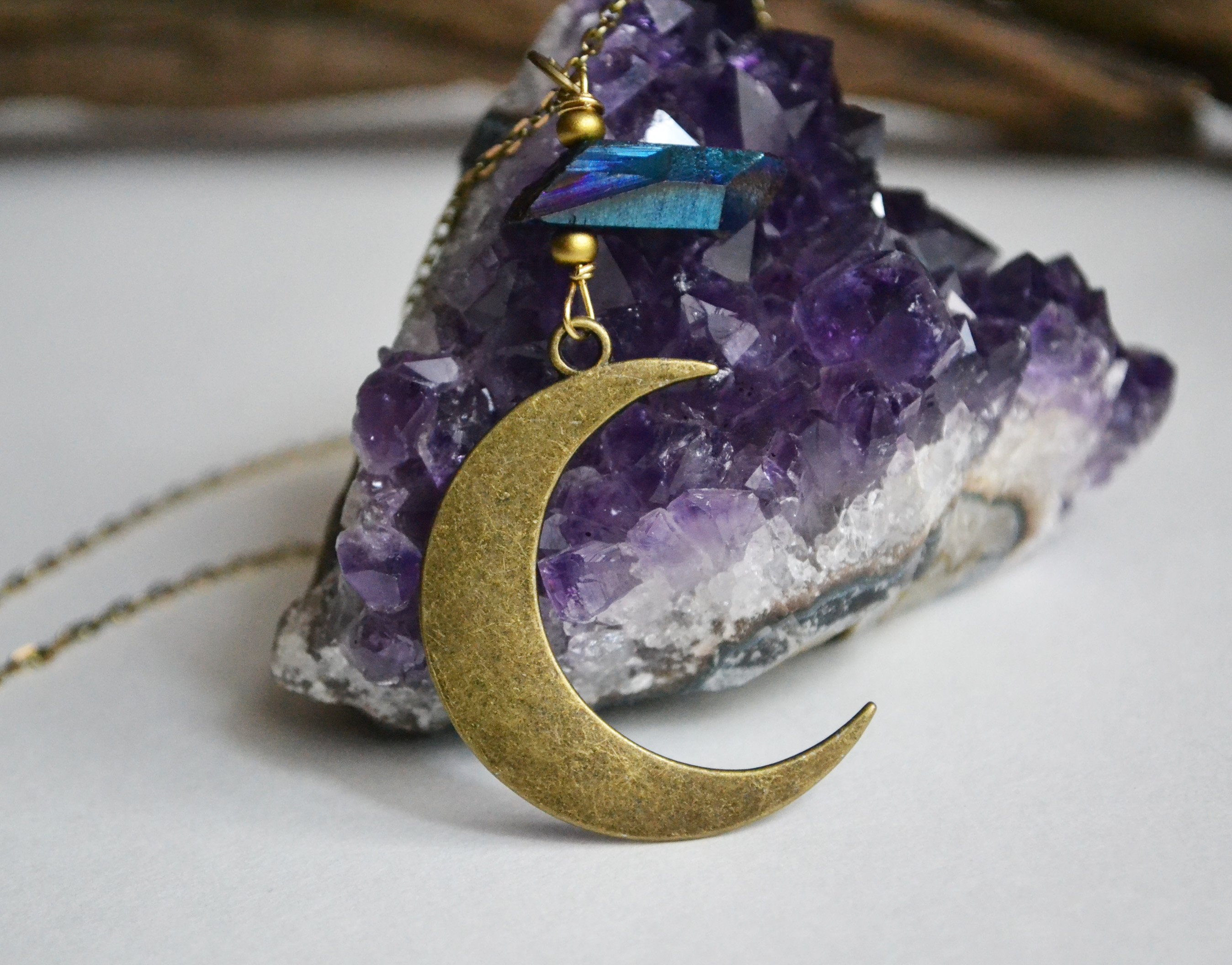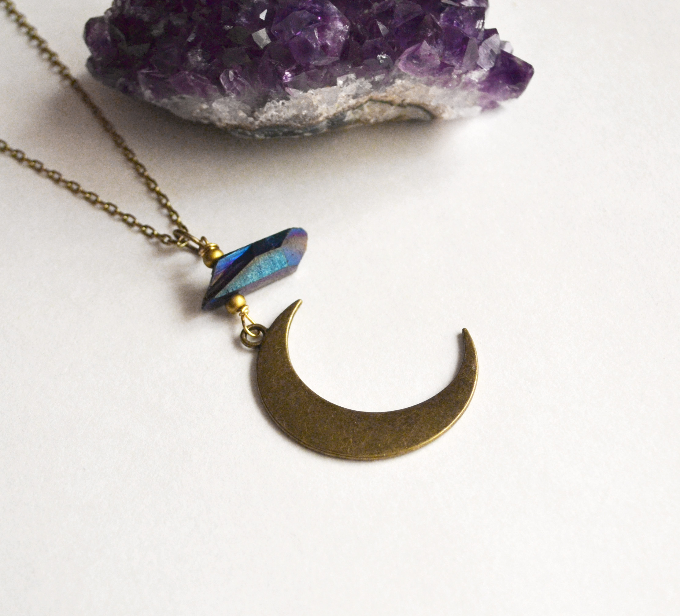 This waning crescent moon necklace looks great paired with one of my Titanium quartz point pieces. The colors shine purple and dark and light blue depending on lighting and what angle it is seen from. Please view all of the photos and choose your chain length at checkout.