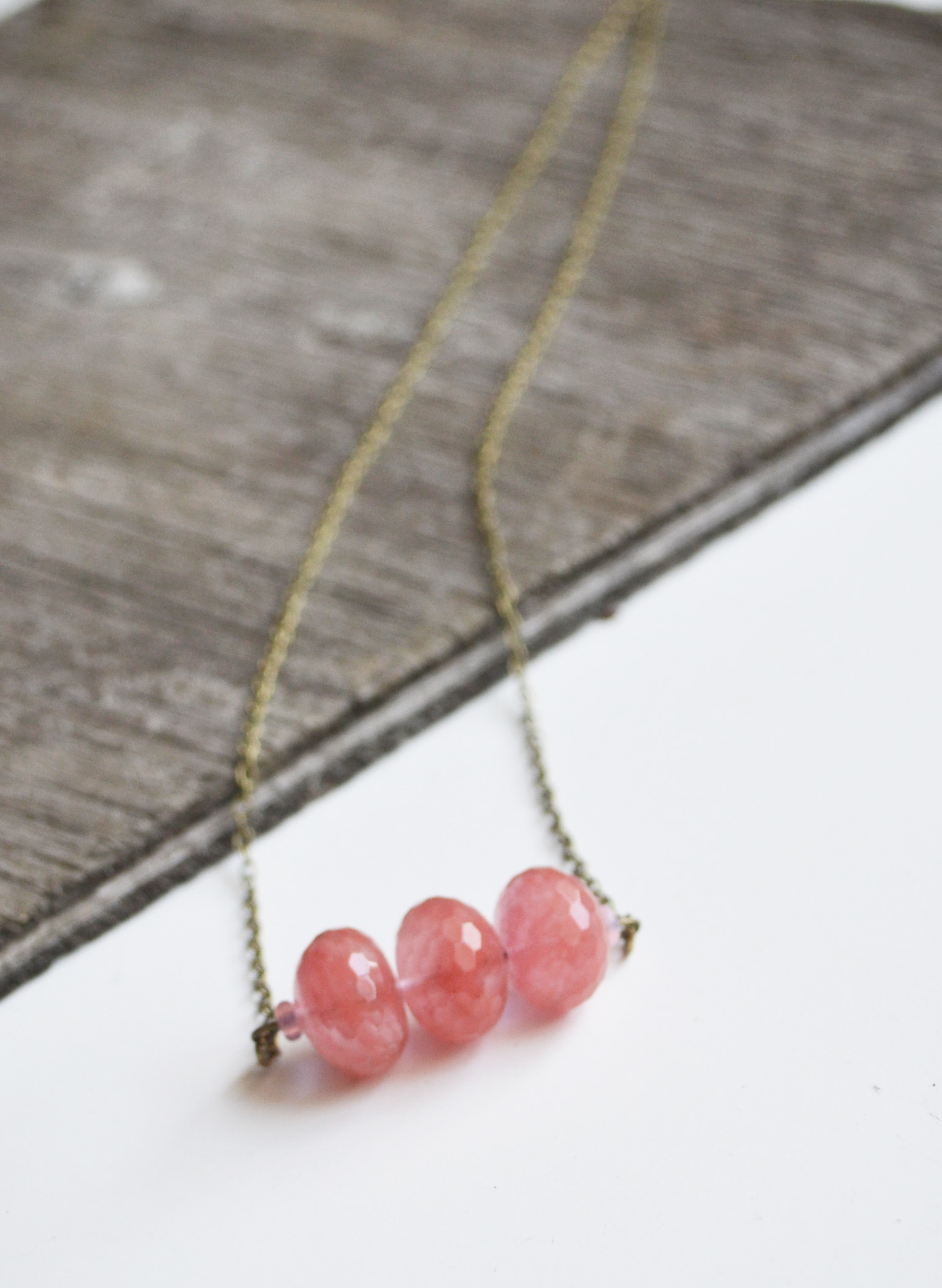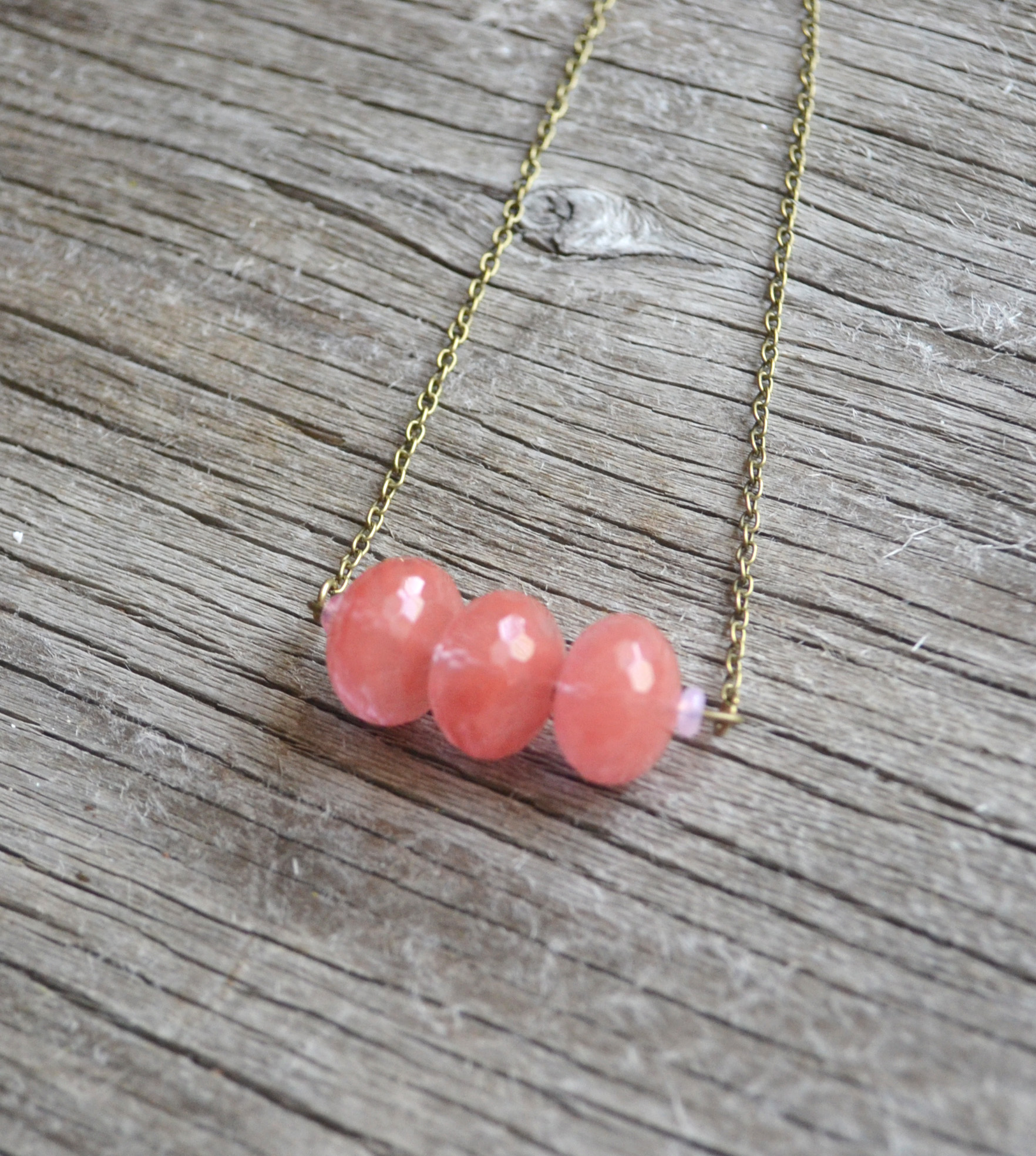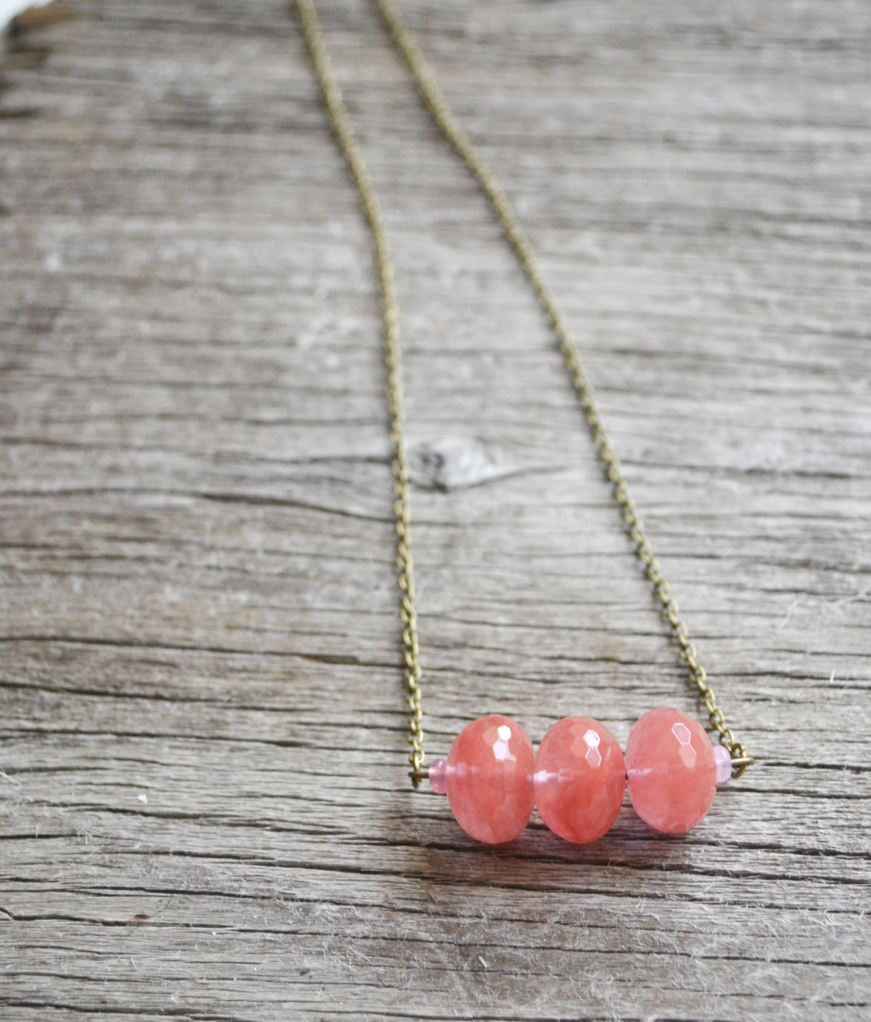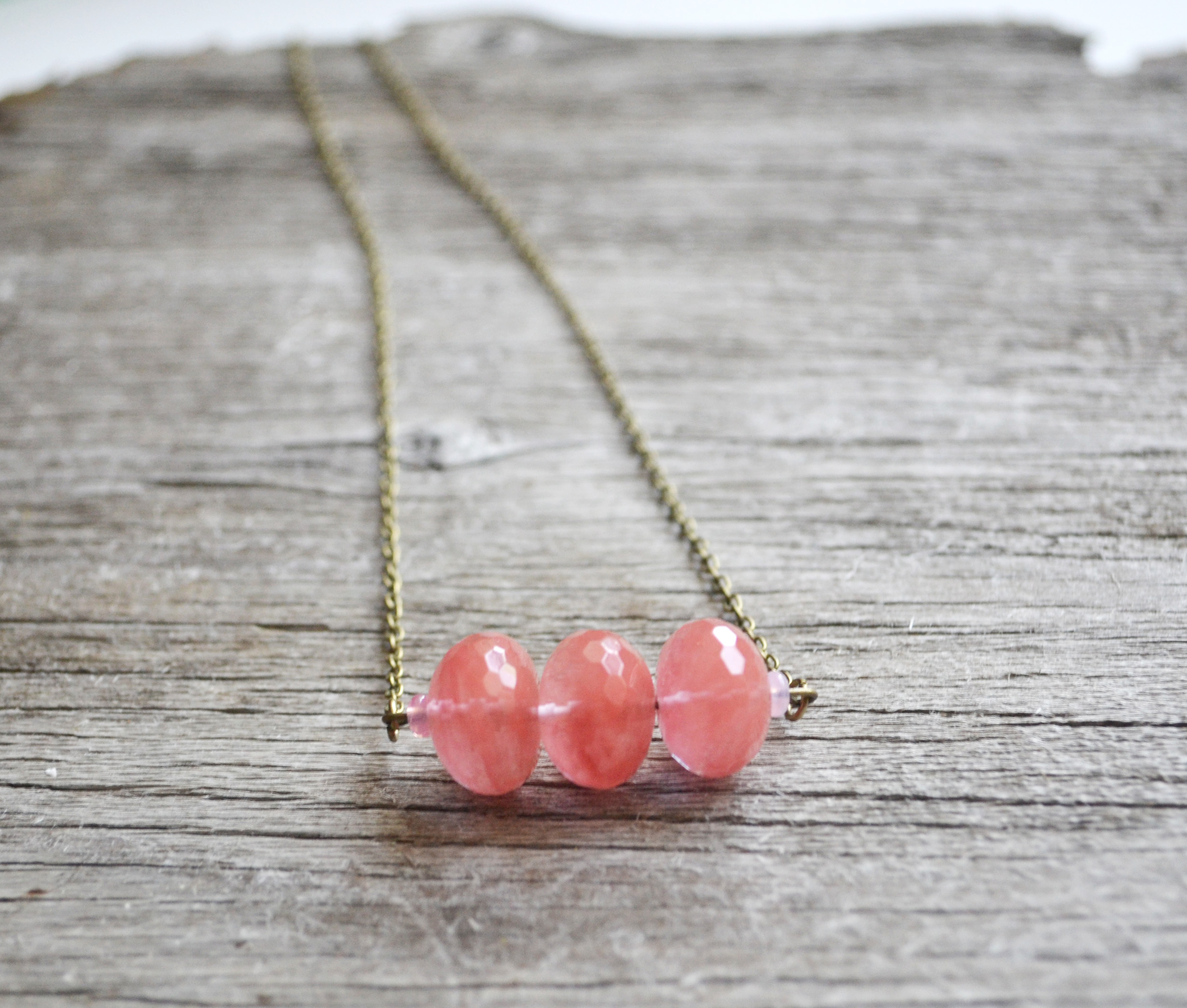 This beautiful shade of Cherry Quartz makes for a lovely necklace. Three faceted rondelle stones side by side with light pink rondelle czech glass beads on the sides. I have paired it with a brass chain and lobster claw clasp.